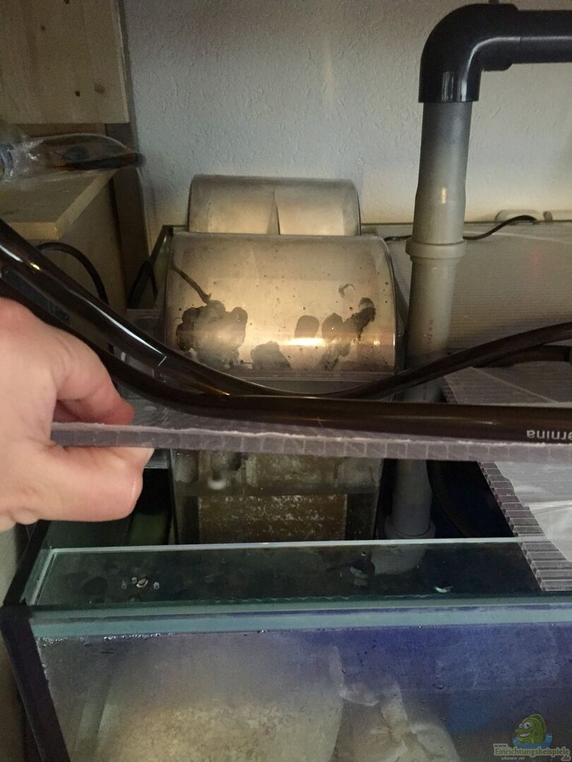 Als Förderpumpe dient eine Aquaforte 6500, die durch ein 25 mm PVC-Rohr schon mächtig Druck entwickelt. Für eine optimale Strömung dienen zudem 2 Tunze Strömungspumpen mit 12.000 l/h und 8.000 l/h. Der Nitratfilter wird mit einer gedrosselten Eheim Compact 600 betrieben. Der Vliesfilter hat einen kleinen Motor mit Schwimmschalter verbaut, der die Vliesrollen entsprechend bewegt.