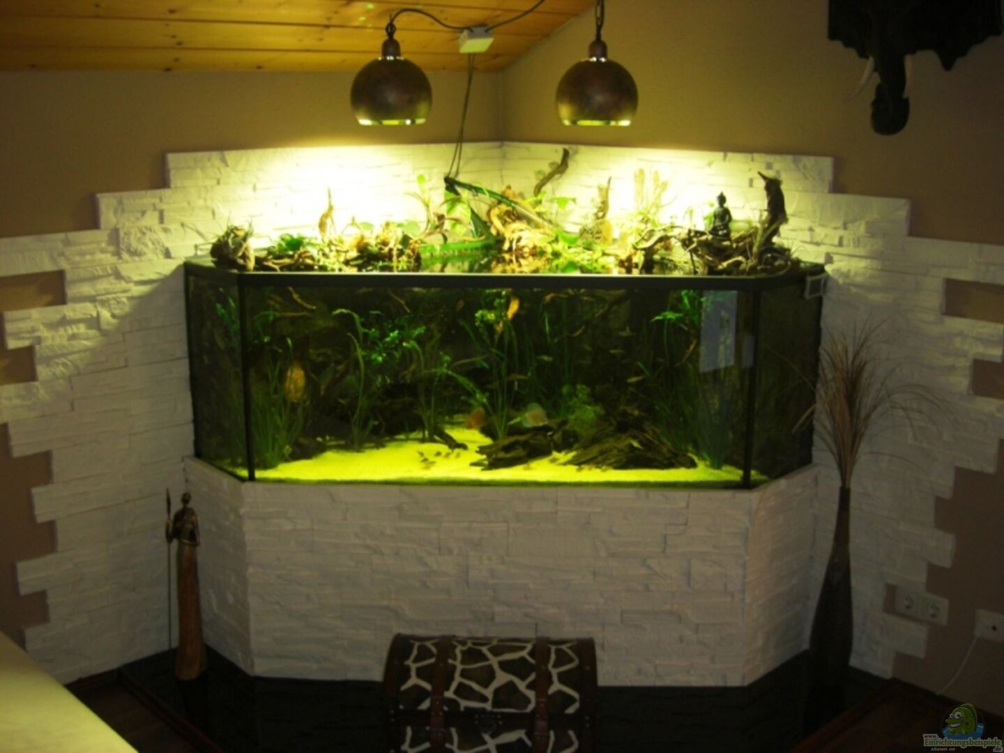 Bodenplatte, Unterbau und Wandverkleidung selbst gebaut. Die komplette Technik mit Schläuchen, Kabeln etc.. ist unterm Dach unsichtbar versteckt. Extraanfertigung der 3D Rückwand