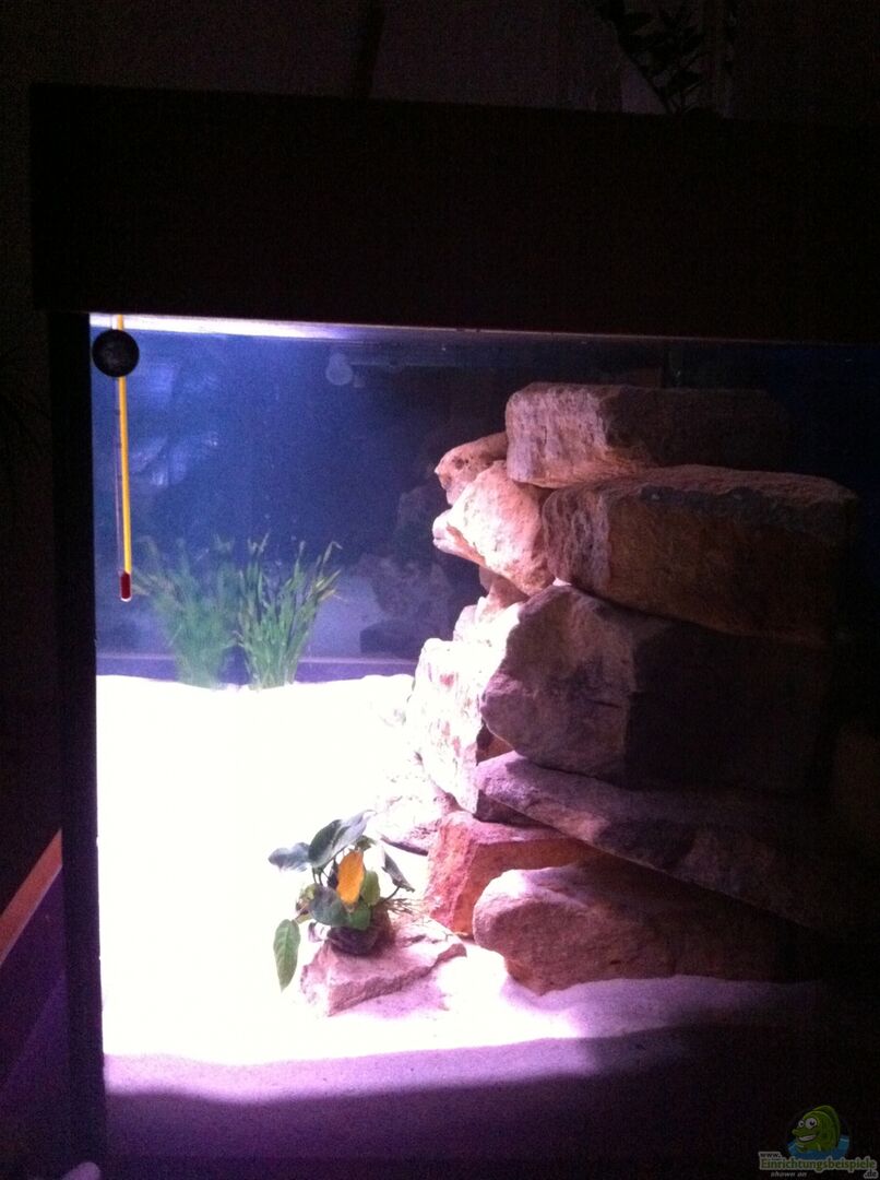 Das Aquarium ist aus 10 mm Floatglas. Die Kanten sind geschliffen, sto??verklebt und mit einer Sicherheitsnaht versehen. Der Unterschrank wurde von meinem Vorgänger selbst gebaut. Auf ihm ist eine Art Auffangschale (ca.15cm hoch). In dieser sind Ablaufschlitze eingebracht. Im Unterschrank ist ein Auffangtank integriert. Falls das Becken ausläuft, wird das Wasser dort aufgefangen. ==================================================================