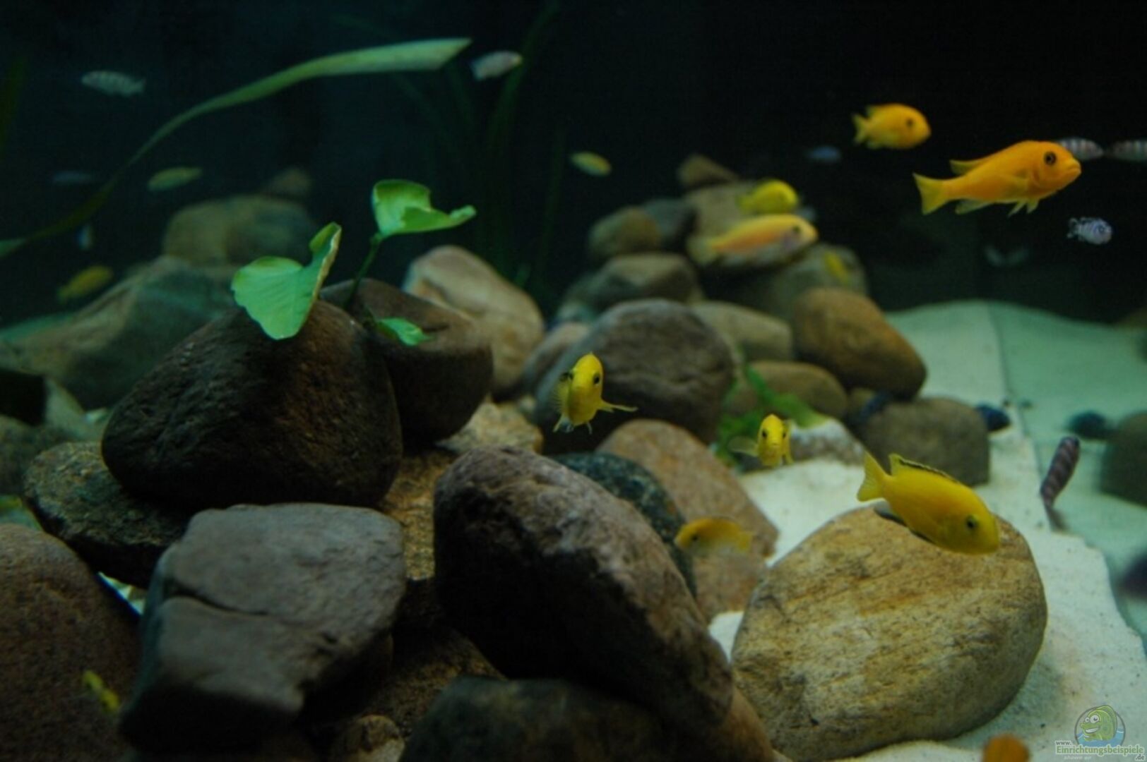 Demasonis, Yellows und Zebras wurden mit dem Becken übernommen, auf Nachfrage beim Züchter wurden mir weitere Demasoni Jungtiere und Lombardois sowie eine Aufstockung der Yellows nahegelegt. - 3/7 Labidochromis caeruleus yellow - 2/3 Pseudotropheus demasoni plus 5 Jugendliche - 1/3 Pseudotropheus zebra - 1/4 Pseuotropheus lombardoi