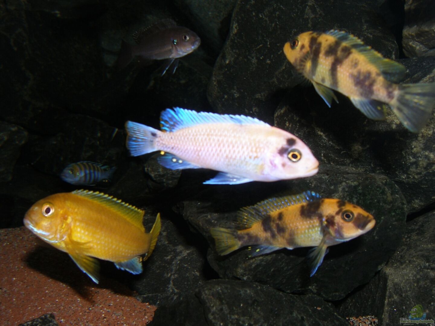 ** 1/4 Metricalima Estherea OB morphe, auch bekannt unter Marmelade Cat 4/7 Cynotilapia Afra Cobue (2/3 WF, 2/2 WFNZ, 0/3 F2) 3/4 Melanochromis Johannii (WF) Metriaclima Estherea OB morphe Grö??e: M ca. 14 cm/ W ca. 10 cm Verbreitung: Kommt vor allem an der Ostküste des Malawisees vor. Vom Chilucha bis zum Nkhungu Reef ist er fast ausschlie??lich im sedimentfreien Felsbiotop zu finden. Lebensraum: Bevorzugt reines Felsbiotop in Tiefen bis meist nur 5 Metern. [...]