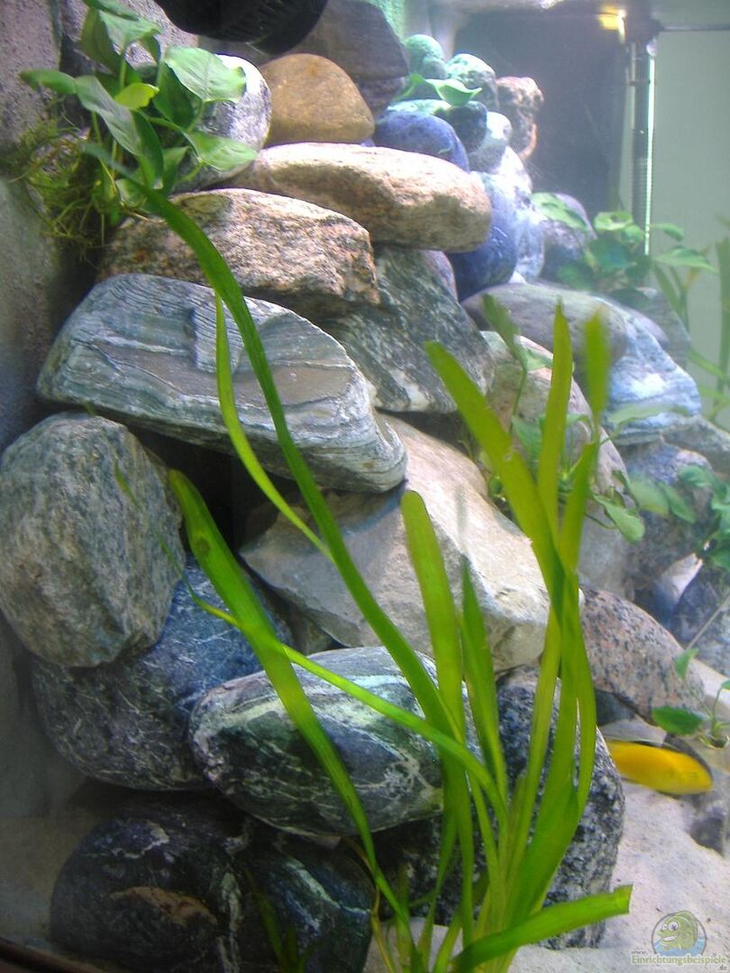 Selbstgebaute Rückwand ( Styropor, Fliesenkleber, Acryllack, 4 Wochen gewässert ), 4mm Plexiglasplatte zum Schutz des Aquarienbodens