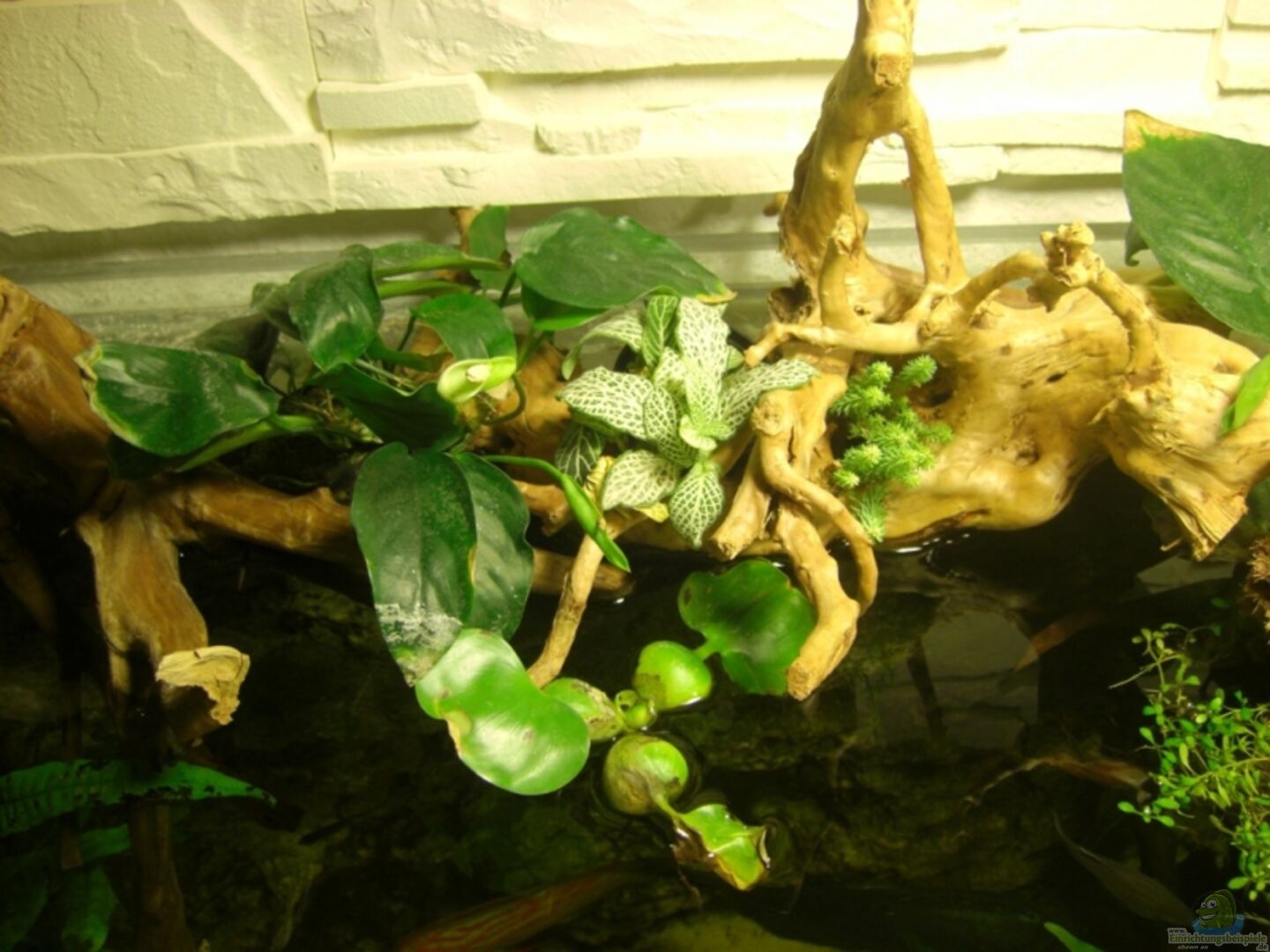 offenes Becken: von oben hängen Rotwurzeln ins Wasser, diese sind teilweise bepflanzt mit Echinodorus & Sumpfpflanzen, deren Wurzeln ins Wasser ragen. Ausserdem bepflanzt mit Tillandsien, welche ich mit Epiphytal Dünger pflege. Auf dem Wasser schwimmend: Wasserhyazinthen.