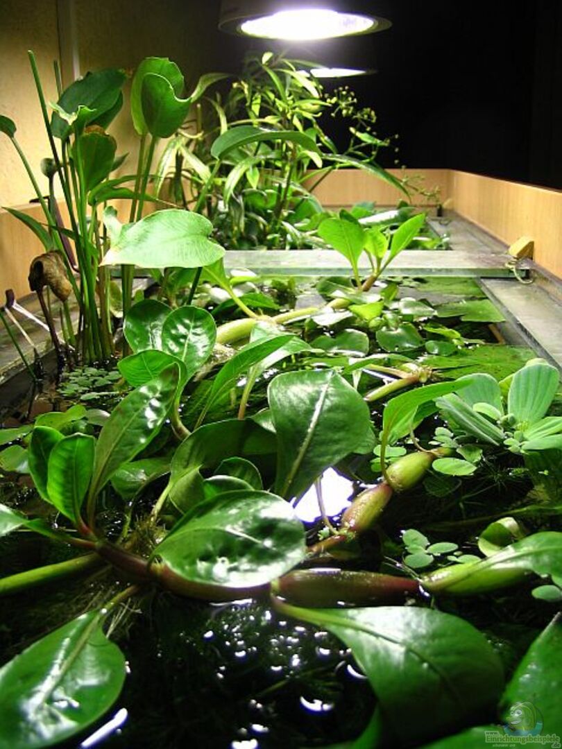 grüner und roter Tigerlotus aufgebundener Javafarn genoppter Wasserkelch ? Blätter werden locker einen Meter lang Echinodorus tenellus Froschlöffel in Töpfen an der Rückwand als ´Sumpfpflanzen´ eingehängt Wasserhyzinthen, Froschbiss, Muschelblumen und die schwimmenden Lotusbätter als Schwimmpflanzendecke Als Nitratzieher eine eingehängte Efeutute, die prächtig wuchert keine CO2 Anlage, es wächst auch so hervorragend gedüngt wird mit DRAK Ferdrakon und Daydrakon