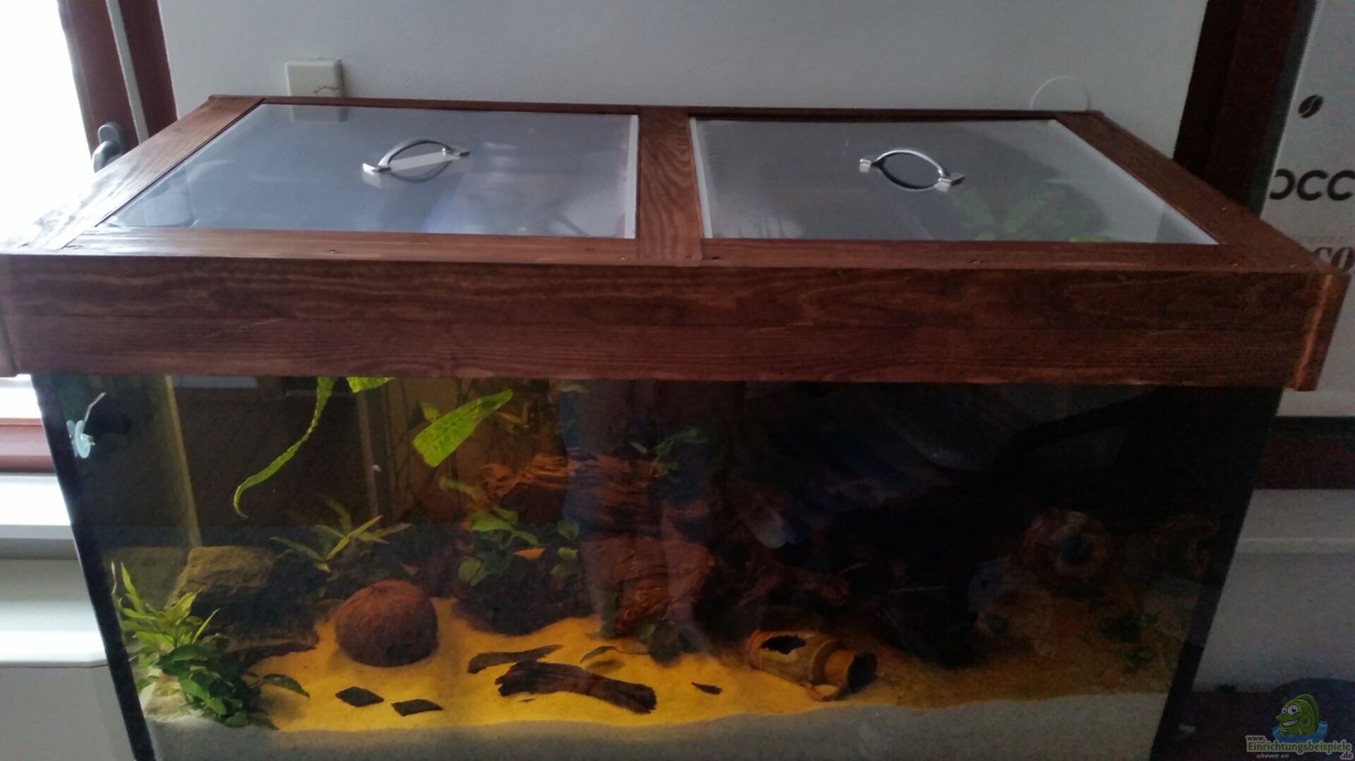 Ganz normales Aquarium. Aquarium kann durch 2 Plexiglasscheiben von oben eingesehen werden.
