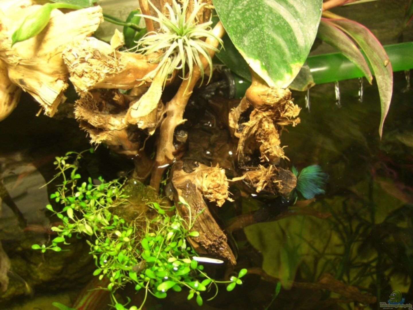 offenes Becken: von oben hängen Rotwurzeln ins Wasser, diese sind teilweise bepflanzt mit Echinodorus & Sumpfpflanzen, deren Wurzeln ins Wasser ragen. Ausserdem bepflanzt mit Tillandsien, welche ich mit Epiphytal Dünger pflege. Auf dem Wasser schwimmend: Wasserhyazinthen.