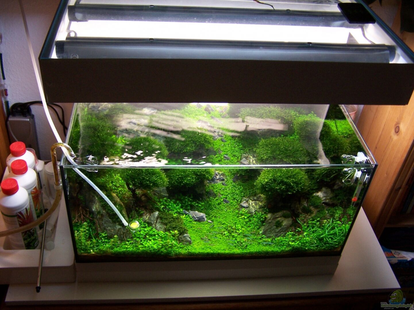 Es handelt sich um ein Standardbecken von MP(Eheim). Beckenumrandung selbstgebaut aus einem gebrauchten Ikea Lack TV-Tisch und Baumaterial ausm Baumarkt wie dünner Presspan wei?? beschichtet, Plexiglas, Lack, Schrauben etc. Die Hintergrundbeleuchtung ist ebenfalls DIY. Zunächst habe ich die rückwertige Seite mit Milchglasfolie beklebt. Im "Technikschacht" zwischen Becken und Rückwand sind noch 10cm Platz geblieben. Darin hängen die beiden Rucksackfilter zudem habe ich [...]