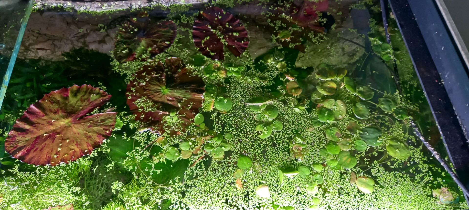 Pogostemon stellatus Echinodorus bleheri Anubias Nana Valisneria Nana Cryptocoryne undulata Wheeping Moos Flame Moos Christmas Moos Riccia Fluitans Echinodorus 'Barthii' Nymphaea lotus Rotala wallichii Javafarn Bucephalandra (keine Ahnung welche) Limnobium laevigatum Lemna minor