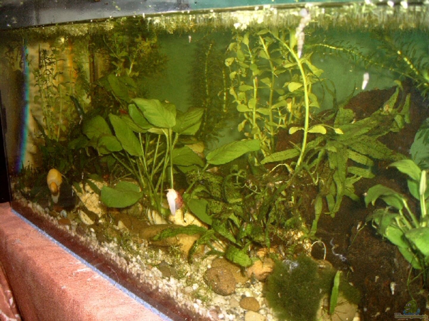 Das Becken fasst zwar 54l, es ist aber nicht ganz bis oben hin gefüllt. Optisch ist das sicherlich nicht sonderlich ansprechend. Aber ich habe mich dennoch dazu entschieden, da mir die Pflanzen, die oben aus dem Wasser ragen, ansonsten verbrennen. Au??erdem konnte ich beobachten, da?? die Zwergkrallenfrösche sich bei abgesenktem Wasserstand fast täglich an der Wasseroberfläche sonnen und dazu teilweise sogar auf die herausragenden Pflanzen kriechen.