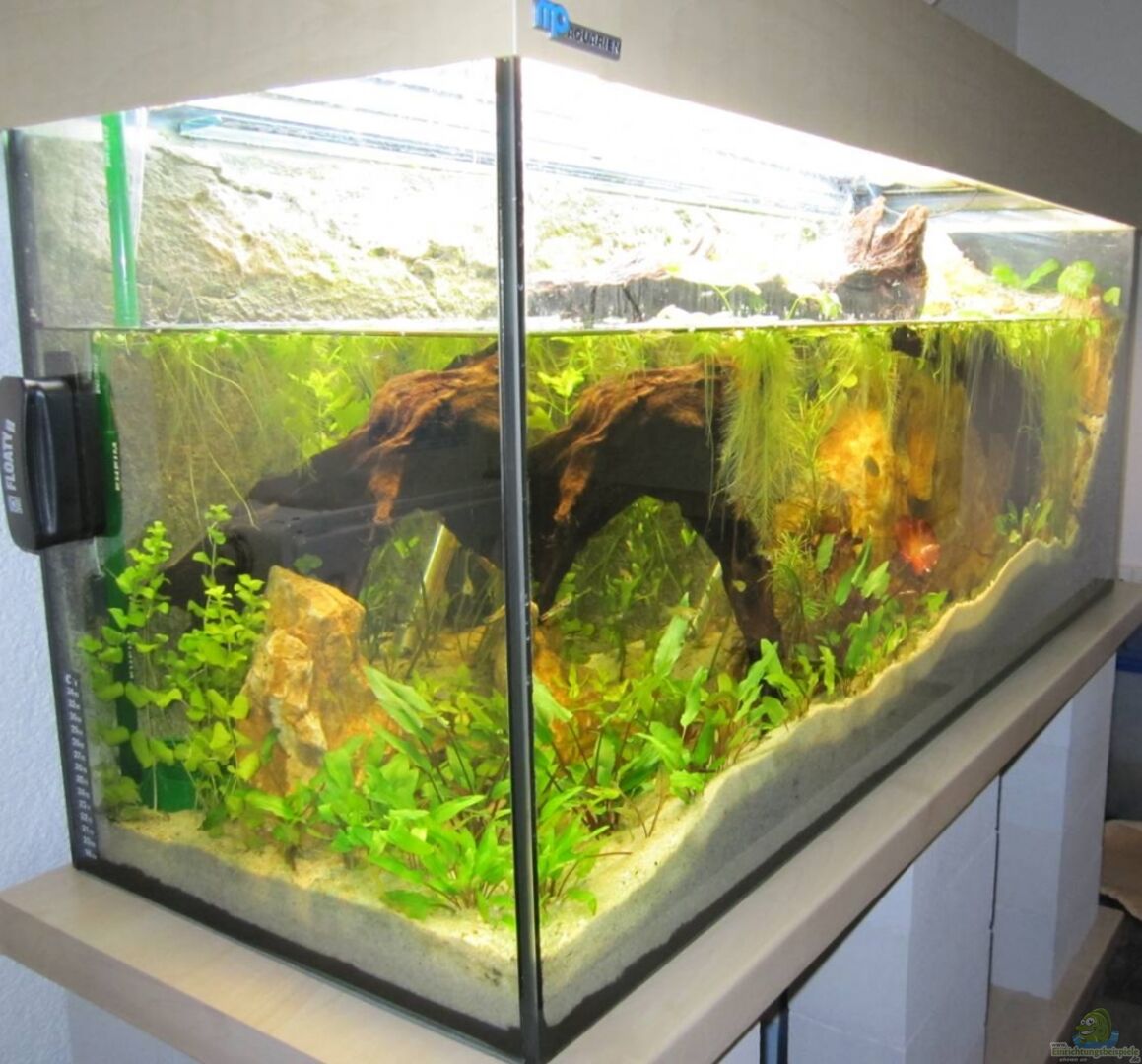 *diverses Kalkgestein aus dem Garten (auf eine 1cm dicke Styroporplatte direkt auf dem Aquarienboden aufgebaut; so können es die Schneckenbuntbarsche nicht untergraben) *grober Kies (>8mm) und Kies (5-8mm) zur Aufschüttung des Landteils *2 Mangrovenwurzeln Grö??e L *ca. 30 Tanganjika-Schneckenhäuser