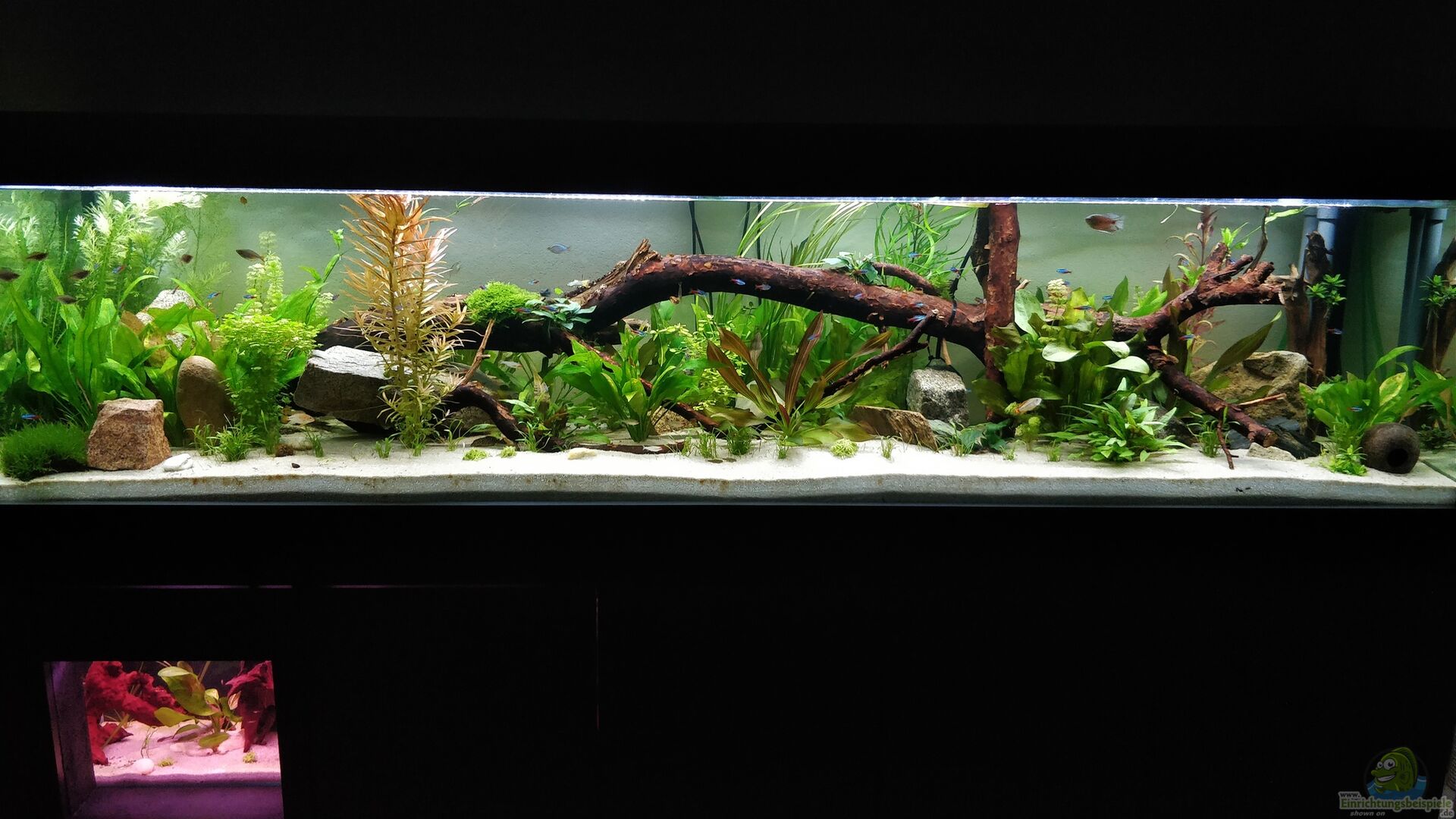 2 x 40 mm Bohrung rechts oben auf der Seite für Ablauf und Notüberlauf, automatischer Wasserwechsel ca 50L täglich, mit Überlauf vom 160L Filterbecken. Unter dem großen Becken ist jetzt ein kleines Aufzuchtbecken. Wird auch über den großen Filter betrieben.