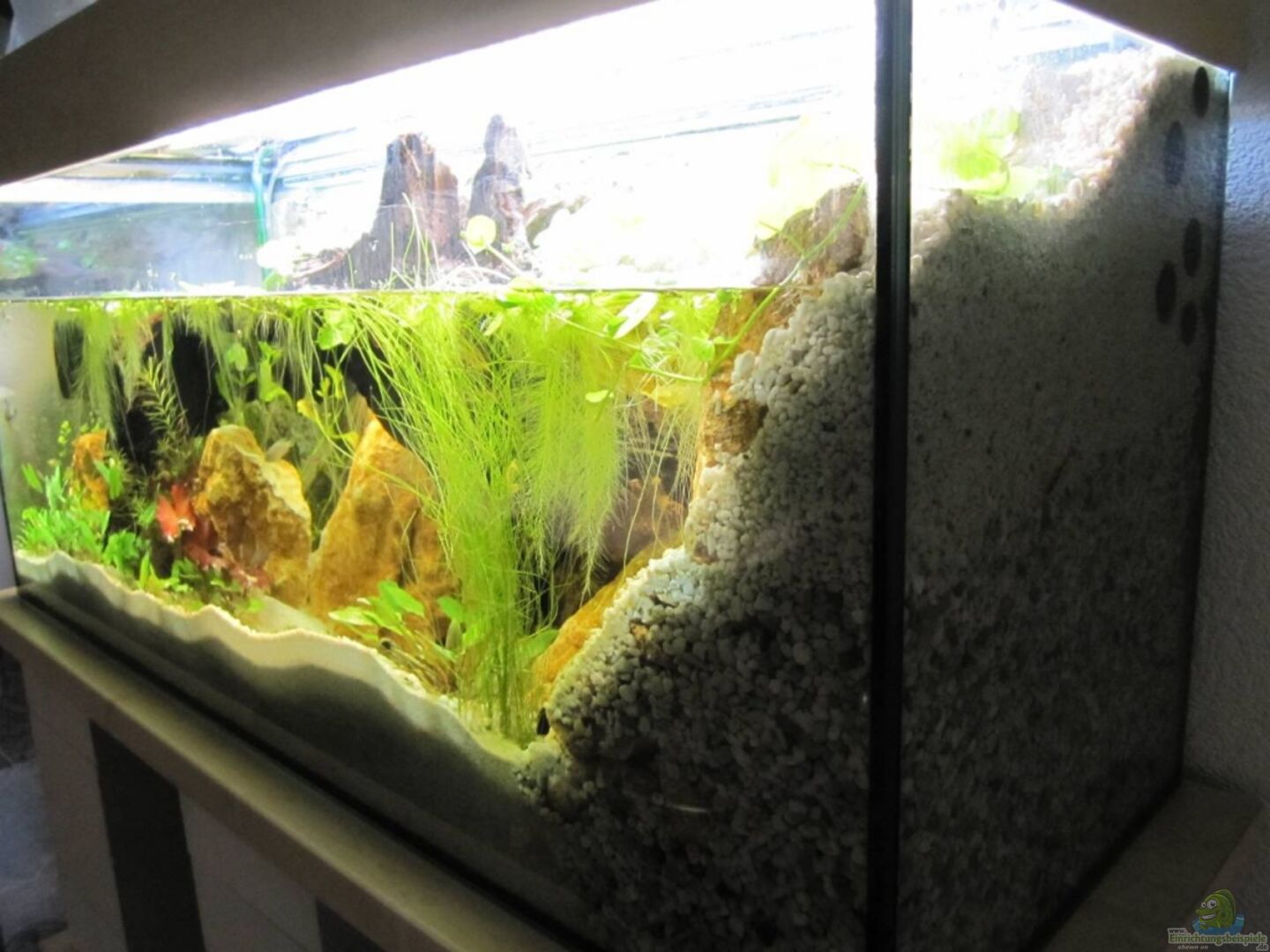 *diverses Kalkgestein aus dem Garten (auf eine 1cm dicke Styroporplatte direkt auf dem Aquarienboden aufgebaut; so können es die Schneckenbuntbarsche nicht untergraben) *grober Kies (>8mm) und Kies (5-8mm) zur Aufschüttung des Landteils *2 Mangrovenwurzeln Grö??e L *ca. 30 Tanganjika-Schneckenhäuser