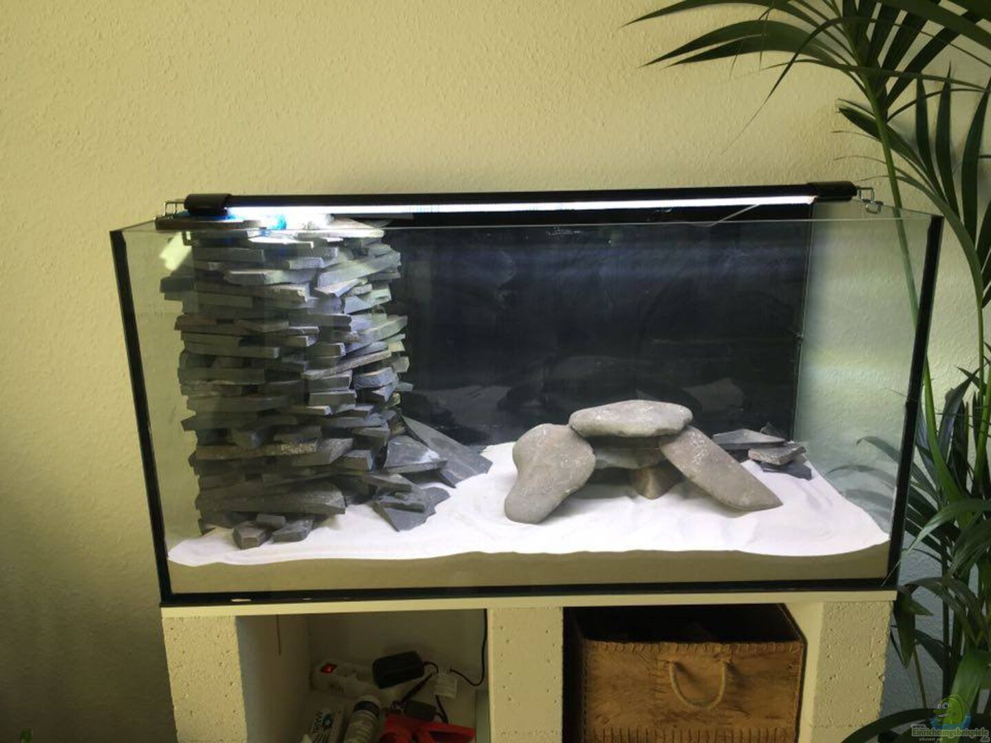 Das Becken war ursprünglich ein Terrarium, welches ich gefunden habe. (Ja, tatsächlich gefunden). Ich habe alle Glaseinbauten herausgeschnitten und das Glas gesäubert. Unterbau, Filter und Riff wurde selbst gebaut. Der Unterbau besteht aus 10cm dicken Porenbetonsteinen, darunter und dazwischen sind 16mm Regalböden aus dem Baumarkt. Da die Zwischenräume zwischen den Säulen nur circa 35cm gro?? sind, passend für die Ikea Expedit-Boxen, rechne ich nicht damit, dass sich die Platten verbiegen. [...]