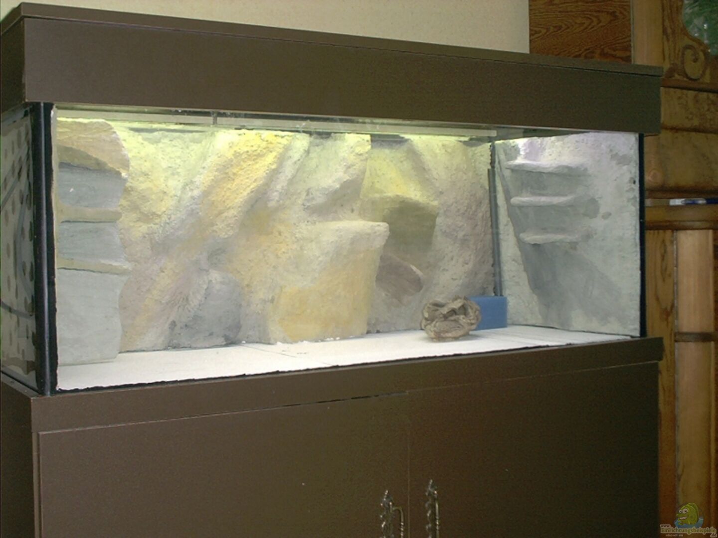 Rückwand und Seiten Selbstbau aus Styropor und Estrichzement, eingefärbt mit Abtönkonzentrat für Wanddispersionsfarbe. Nachbehandelt mit 2 Kommponenten Epoxiedharz 2 mal Gestrichen. Gewässert 14 Tage und mit Aktivekohle gefiltert. Bruchnatursteine Braun-rötlich