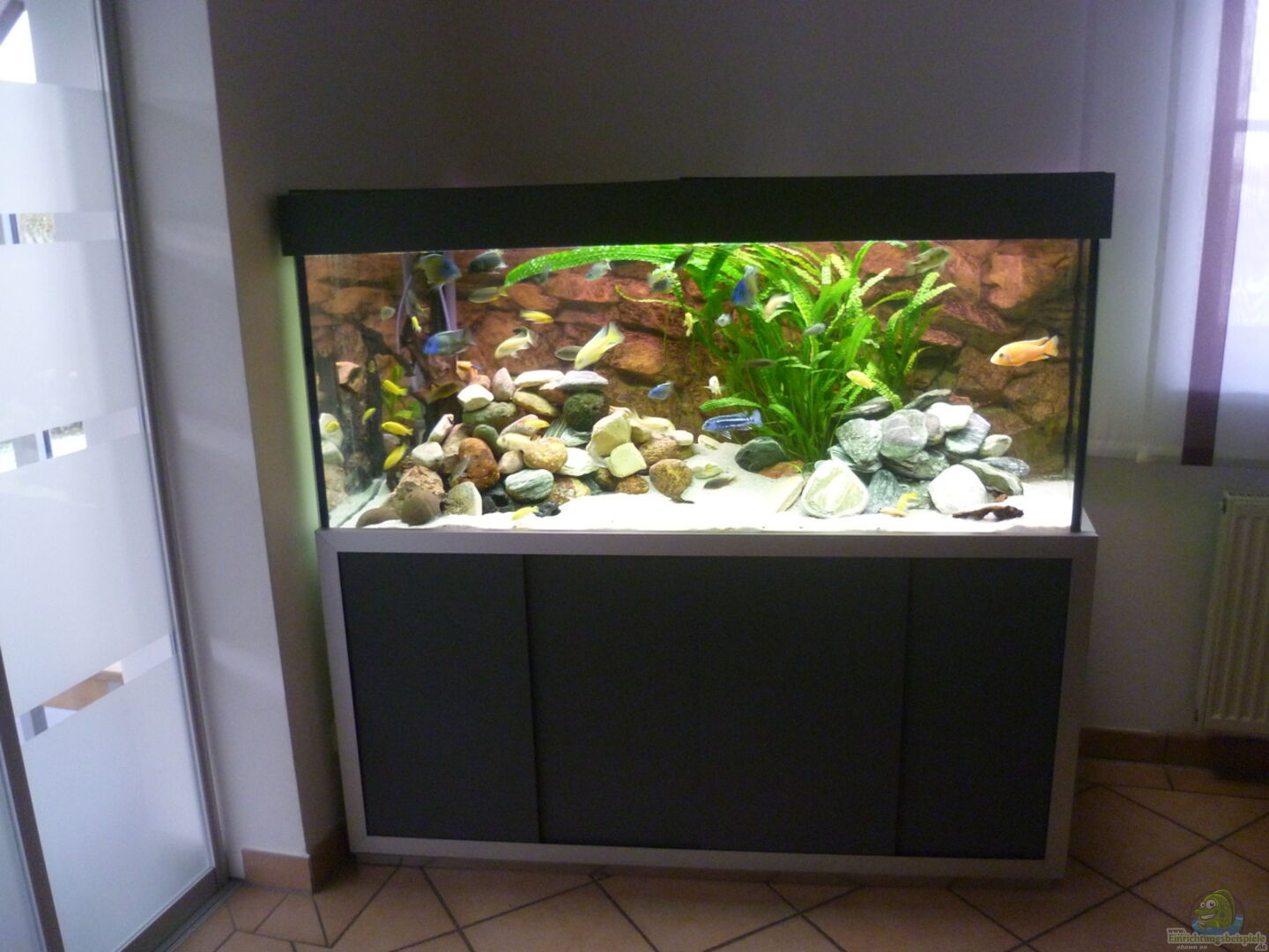 Das Becken hat ein Sonderma?? 150L rechts 80 tief links 50 und 65 hoch 12mm Glas ca.640L Brutto Das Becken habe ich seit 2011 Umbau war mitte März 2014 Der Unterschrank ist aus 30mm Vierkant Stahlrohr Abdeckung aus HPL PLatten Alles in Eigenbau. Lediglich der Alurahmen der Front wurde bei Marine Systems gekauft.