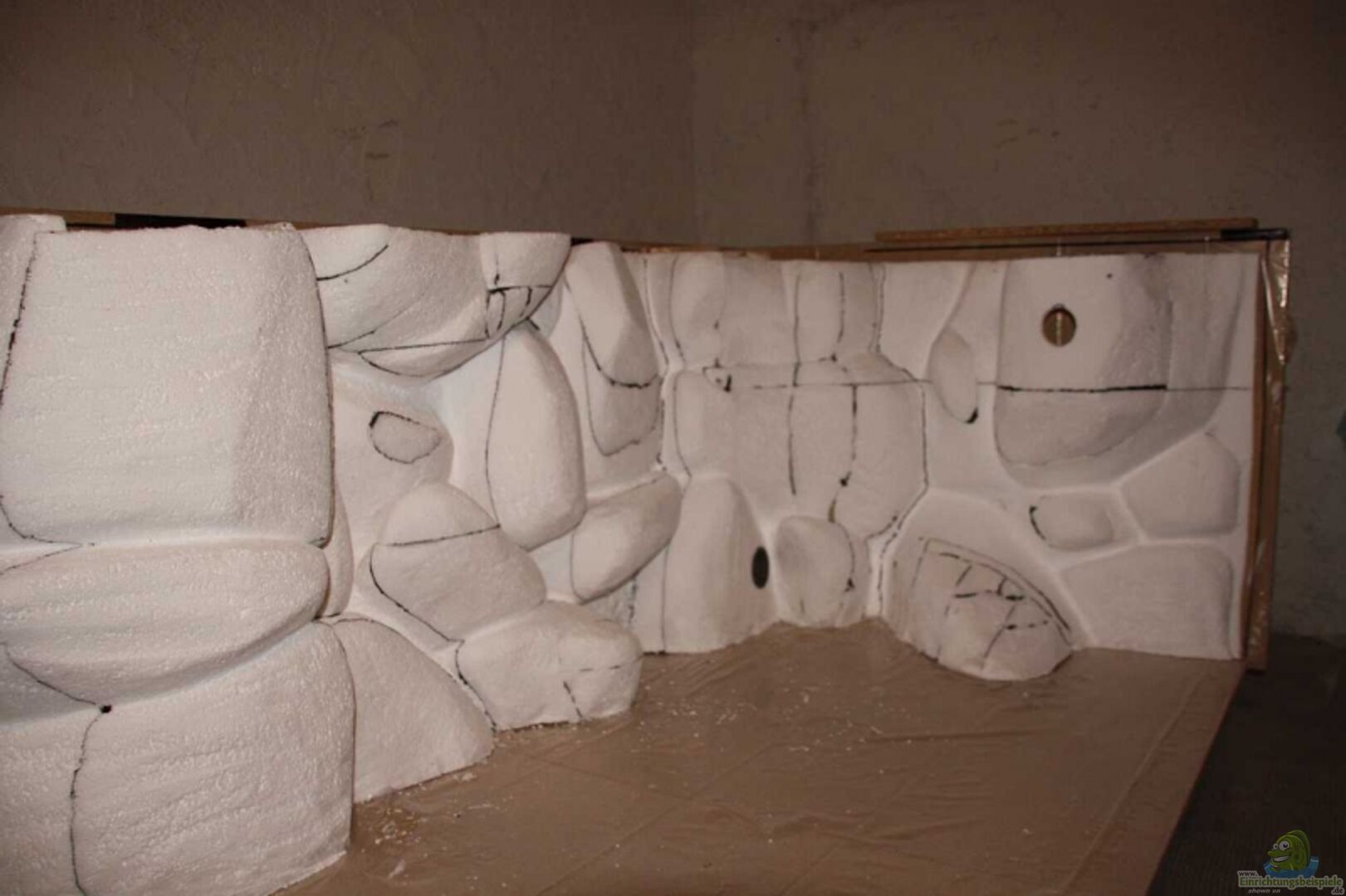 Die Rückwand habe ich selber gemacht. Dazu habe ich das Aquarium d.h. die Bodenplatte, die hintere Scheibe, die Seitenscheibe und den ??berlaufschacht aus Holzspanplatten nachgebaut. Dann wurden Styroporplatten mit Aquariumsilikon verklebt und ins Model eingeklebt und mit dem Messer bearbeitet. Als die Rückwand nach meinem geschmack war wurde das Styropor mit Zement überzogen. Dann habe ich noch ein paar freistehende Steine gebaut. Als alles getrocknet war wurde das ganze in Kunststofftanks [...]