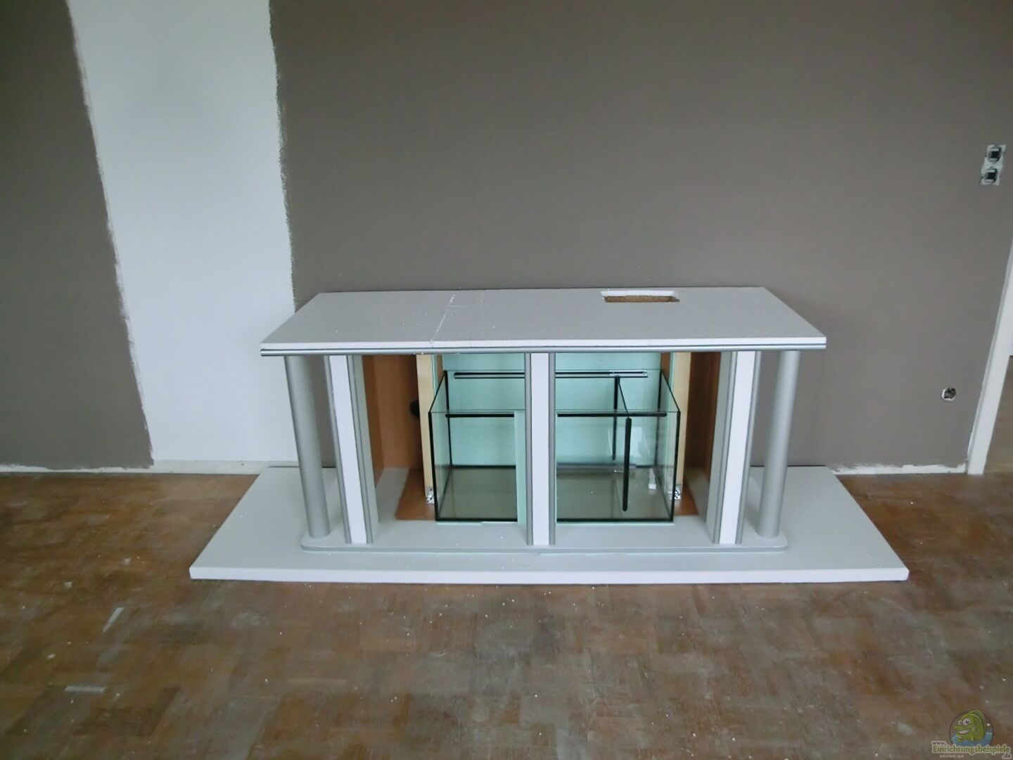 Becken Das Becken wurde am 29.06.2012 bei MAT (Meyer Aquarien Technik) aus Klein Lafferde bestellt. Es ist sto??verklebt mit Sicherheitsinnennaht und 12mm Glas. Au??erdem hat es 2 40er Bohrungen und einen 20x20 cm ??berlaufschacht. Zur Stabilität hat das Becken 2 Seitenstreben und eine Mittelstrebe. Die Lieferung erfolgte am 21.09.2012. Am nächsten Tag wurde es dann zu 4. in den ersten Stock getragen. Um es besser tragen zu können, wurde es mit der Bodenplatte nach oben zeigend getragen. [...]
