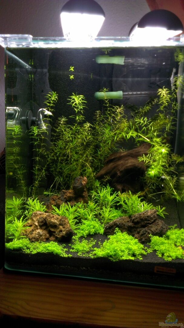 Die Vorrichtung des Hamburgermattenfilter ist mit Schieferstückchen beklebt. Die selbstgebaute Schieferrückwand ist ebenfalls fest eingeklebt. Die Seiten der Rückwand sind nicht komplett geschlossen. So haben die Garnelen die möglichkeit sich dahinter zu verstecken. An dieser Stelle gab es schon interessante Beobachtungen. Mittlerweile sucht hat auch die Wasserpest die Lücken entdeckt und wächst fröhlich dahinter weiter.