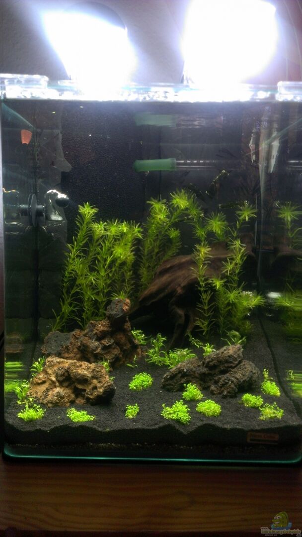 Die Vorrichtung des Hamburgermattenfilter ist mit Schieferstückchen beklebt. Die selbstgebaute Schieferrückwand ist ebenfalls fest eingeklebt. Die Seiten der Rückwand sind nicht komplett geschlossen. So haben die Garnelen die möglichkeit sich dahinter zu verstecken. An dieser Stelle gab es schon interessante Beobachtungen. Mittlerweile sucht hat auch die Wasserpest die Lücken entdeckt und wächst fröhlich dahinter weiter.