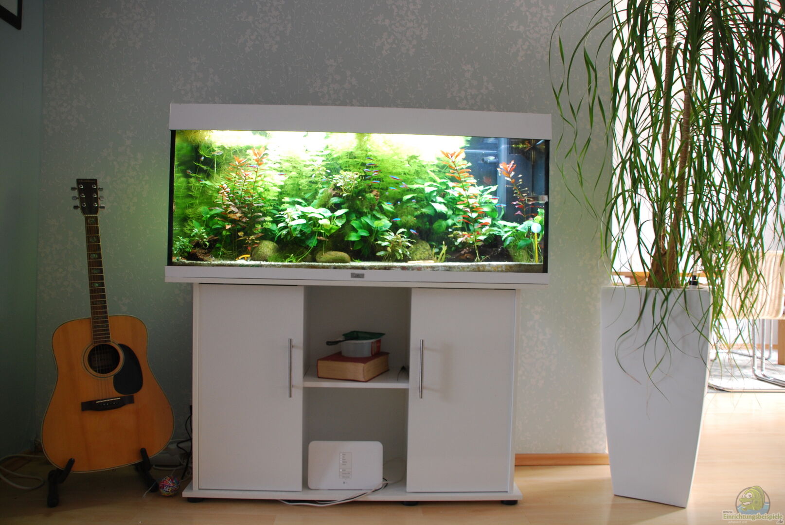 Juwel Rio 240 Aquarium mit eingeklebtem Juwel Innenfilter. Alte Unterschrank Version mit zwei Türen und offenem Fach in Hochglanz Wei??.