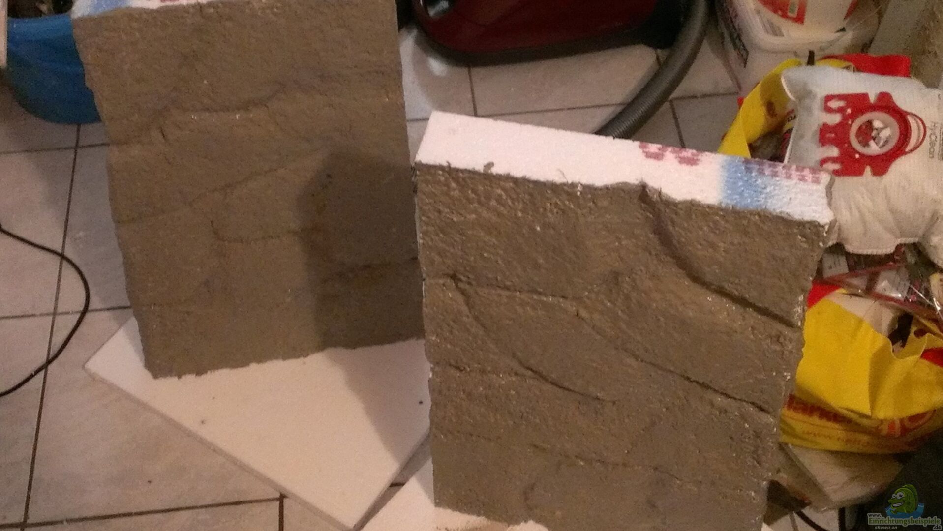 Selbstgebastelte 3D Rückwand aus Styropor und Fliesenkleber. Diese Rückwand hab ich nach dem Wassereinlauf wieder rausreisen müssen, die Farbe löste sich vom Fliesenkleber. Nach gründlicher Ursachenforschung kann es dafür nur eine Erklärung geben: die Restfeuchte des Flie??enklebers. Wenn man bedenkt, das Beton am Tag 1mm trocknet (hat mir ein Fachmann gesagt, bei idealen Bedingungen) hätte ich ja bei schlechten Bedingungen mindestens 14 Tage trocknen lassen müssen. Naja, wie schon einige [...]