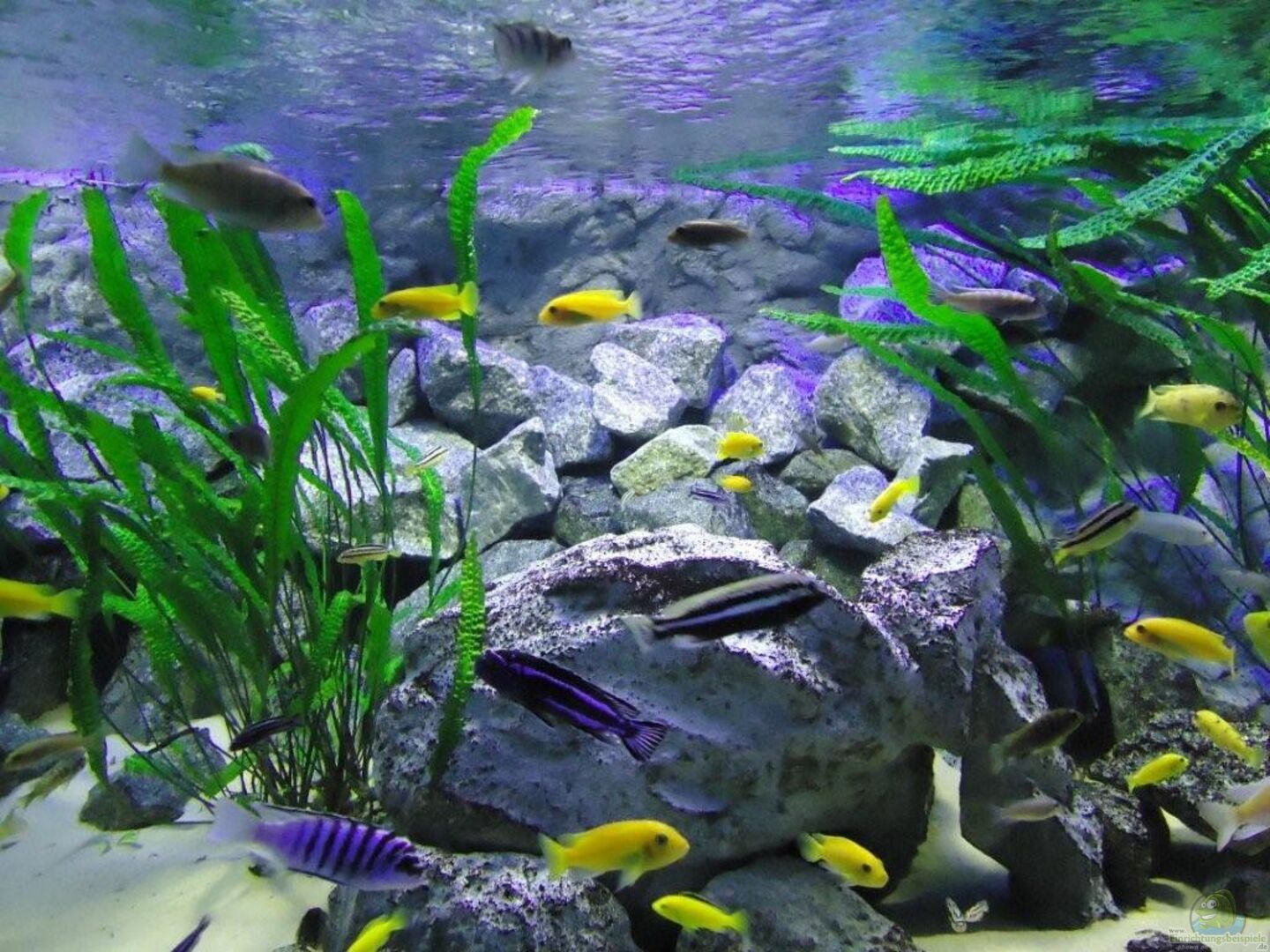 Vordergrund: Dominante Böcke von Melanochromis Maingano und Auratus sowie Ps. Zebra von Mbuna Mick (48)