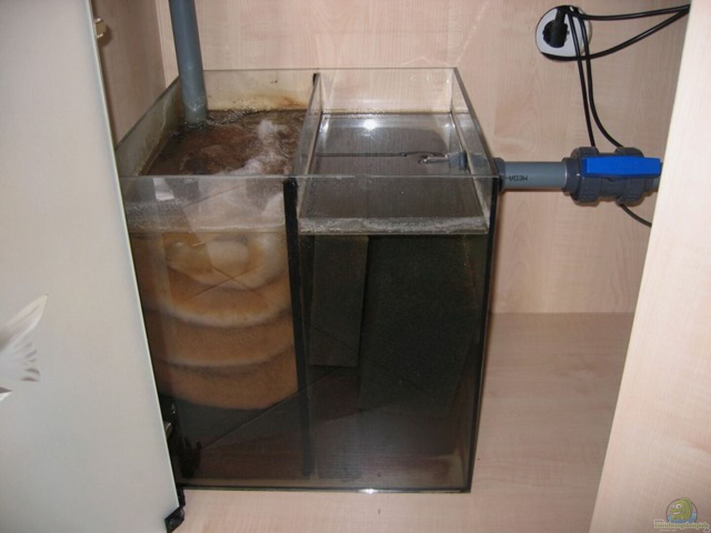 Das Wasser wird durch eine regelbare Tunze-Förderpumpe mit 3500 l/h wieder ins Aquarium befördert. Der Edelstahl-Heizstab sitzt mit im Filterbecken, da ich keine sichtbare Technik im Aquarium haben wollte. Ein 9 Watt UV-Klärer ist mit angeschlossen, wird aber zur Zeit nicht benutzt.