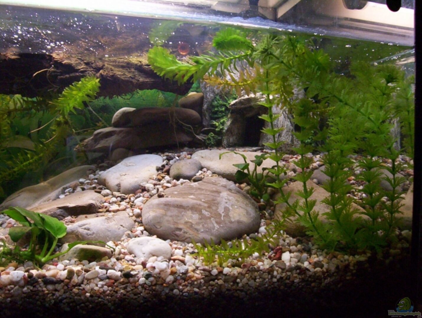 Offenes Molchbecken Kleine Plastikschale auf Stützen eingeklebt An der Rückseite ein 30 cm lange Terrasse angebracht, beides wurde mit Kies befüllt Wasserstand ca. 25 cm