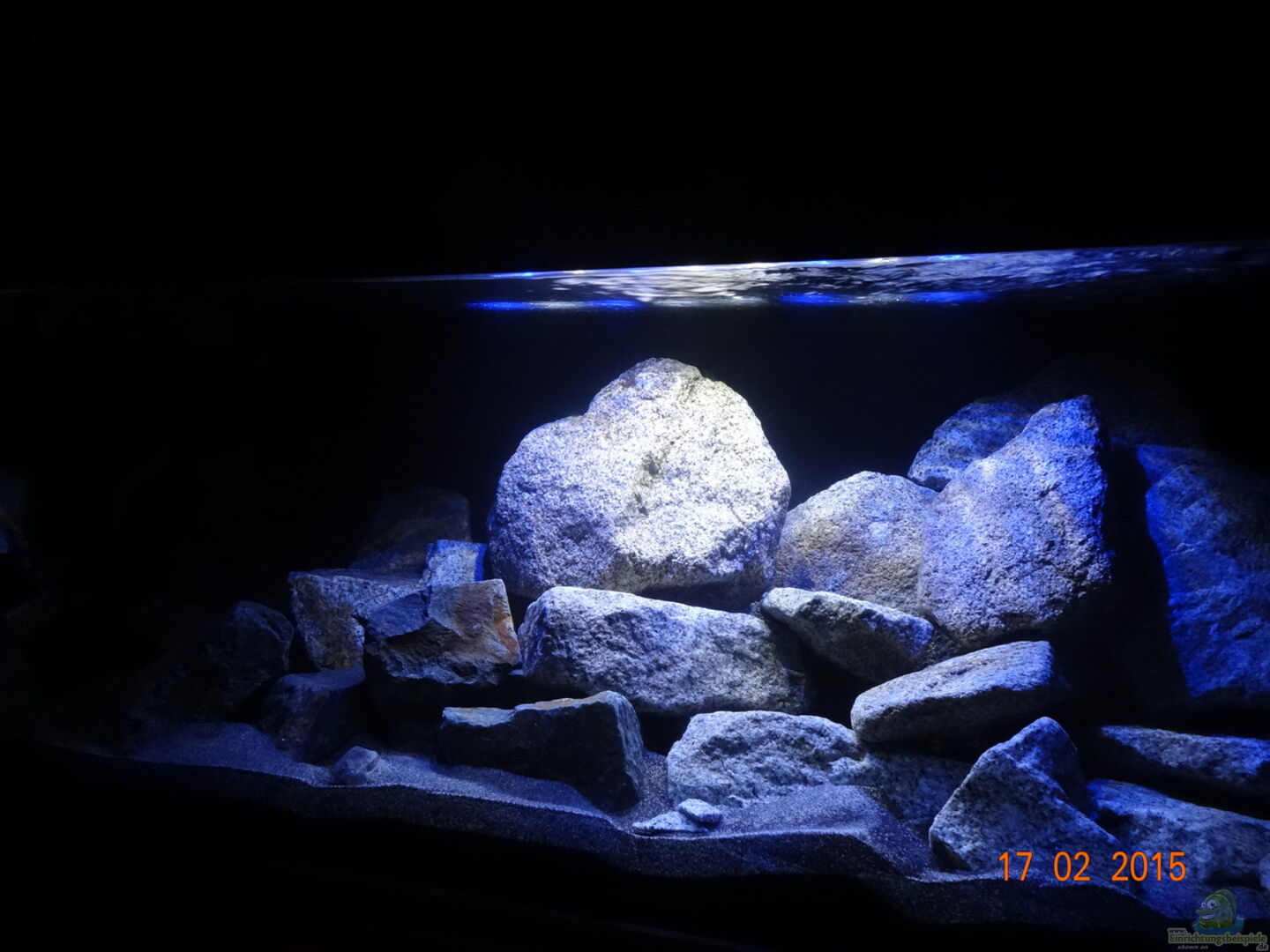 da das Becken nur 50cm tief ist habe ich bewu??t keine 3D-Rückwand in Betracht gezogen um den knappen Raum nicht weiter zu verringern. Die Rückwand und die rechte Seitenscheibe habe ich mit schwarzer Abtönfarbe gestrichen, was trotz nur 50 cm Breite eine super Tiefenwirkung erzeugt. Man kann die hintere Glasscheibe bei der eher schwachen Beleuchtung praktisch nur erahnen. der Aufbau besteht aus ca. 25 Steinen von 1 - 20 kg, hauptsächlich bayrischer Granit, im linken auslaufenden Bereich [...]