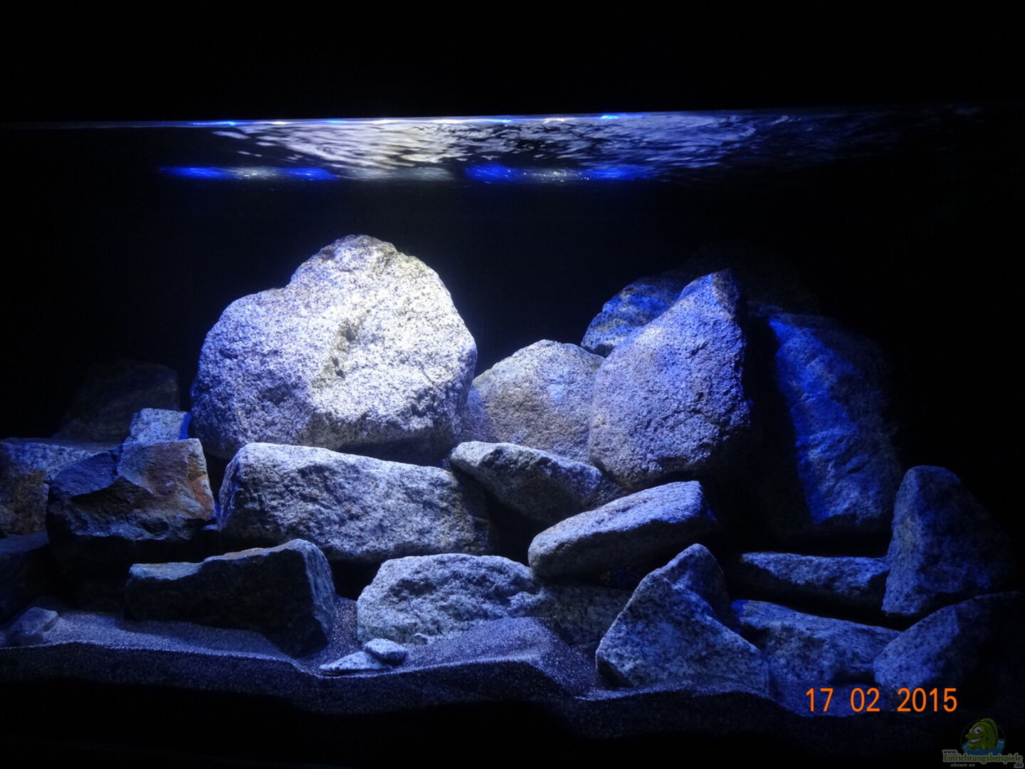 da das Becken nur 50cm tief ist habe ich bewu??t keine 3D-Rückwand in Betracht gezogen um den knappen Raum nicht weiter zu verringern. Die Rückwand und die rechte Seitenscheibe habe ich mit schwarzer Abtönfarbe gestrichen, was trotz nur 50 cm Breite eine super Tiefenwirkung erzeugt. Man kann die hintere Glasscheibe bei der eher schwachen Beleuchtung praktisch nur erahnen. der Aufbau besteht aus ca. 25 Steinen von 1 - 20 kg, hauptsächlich bayrischer Granit, im linken auslaufenden Bereich [...]