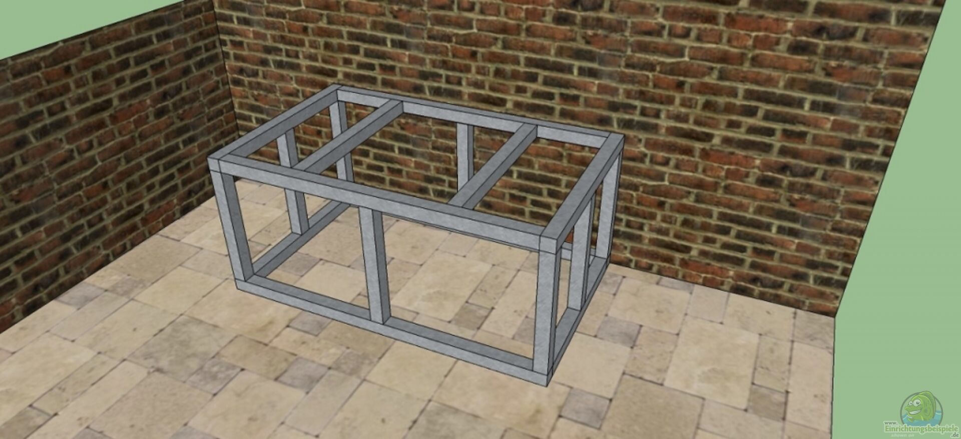 Stahlgestell ist in die Wand einbetoniert. 2 Bohrungen (Ablauf 40mm, Notablauf 40mm). Filterbecken steht in der Dachschräge, zugänglich durch zwei Türen. Gesamtvolumen der Anlage = 1185 Liter An der langen Seite des Beckens wird die Couch stehen (siehe Hauptbild).