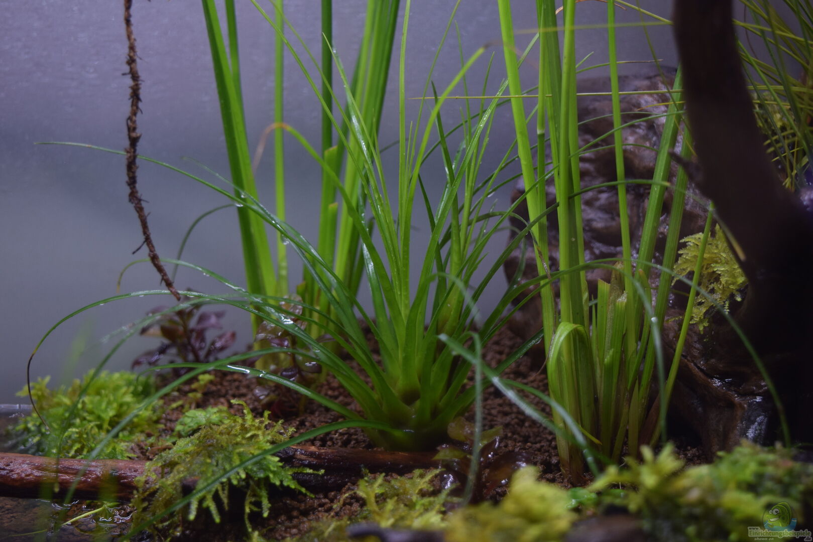 Cyperus zumula (Katzengras), Cyperus haspan, Eleocharis Xingu, emers vorgezogenes Javamoos und Leptodictyum riparium, Salvia natans, Microgramma vaccinifolia, Neoregelia Akeso, Vriesea correia aurajoi, Tillandsia festucoides,