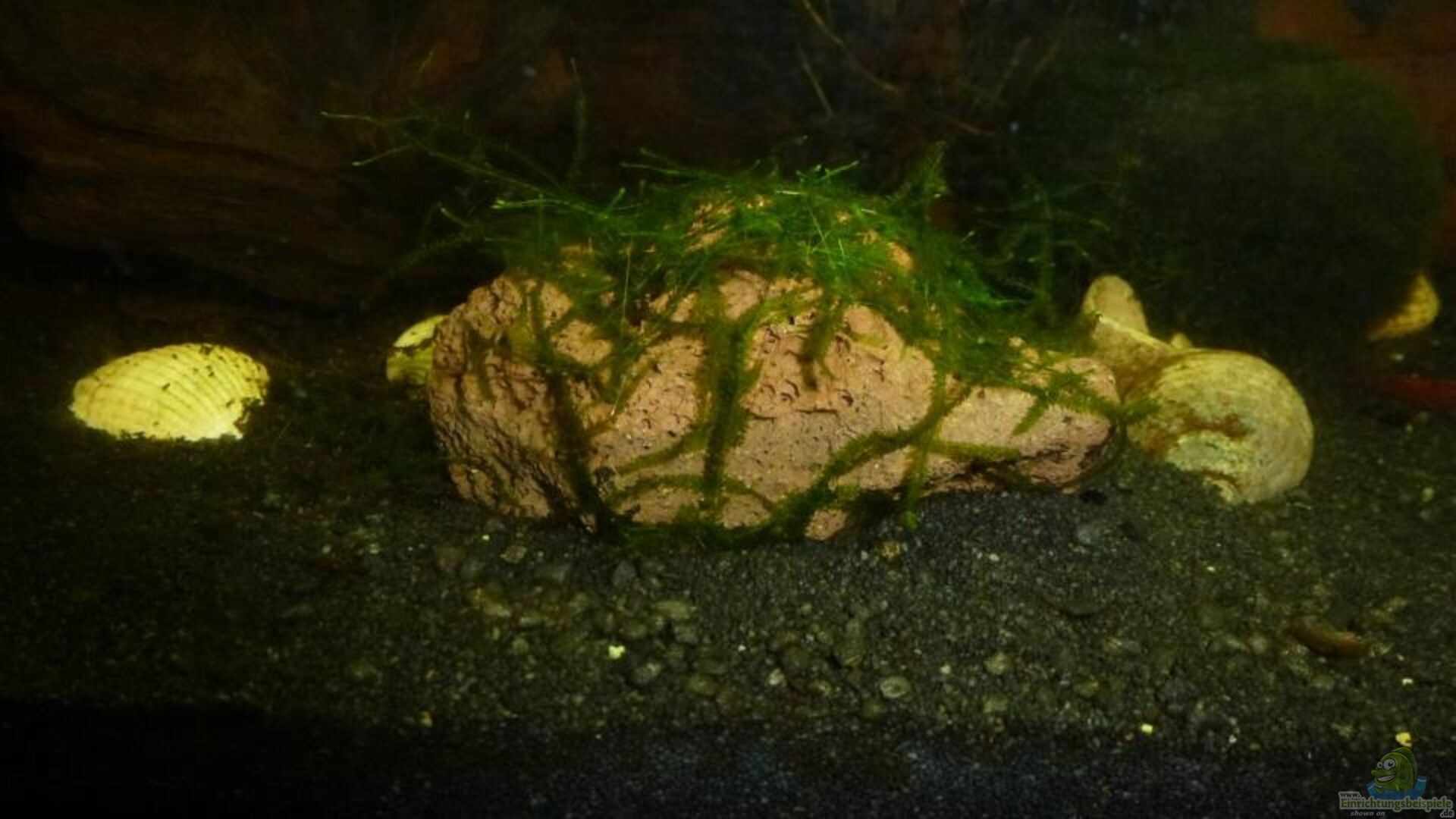 Eine Morkienholzwurzel, eine Kokusnusshöhe mit Moos bewachsen, ein Vulkangestein mit Moos bewachsen, eine Garnelenhöhle mit Moss bewachsen, Morkienholzast mit einem Saugnapf an der Scheibe befestigt und mit Javamoos bepflanzt, Schiefergestein