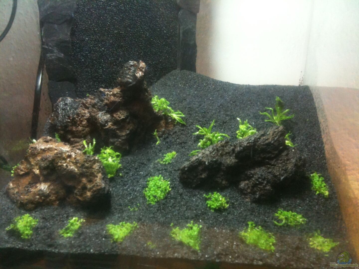 Die Vorrichtung des Hamburgermattenfilter ist mit Schieferstückchen beklebt. Die selbstgebaute Schieferrückwand ist ebenfalls fest eingeklebt. Die Seiten der Rückwand sind nicht komplett geschlossen. So haben die Garnelen die möglichkeit sich dahinter zu verstecken. An dieser Stelle gab es schon interessante Beobachtungen. Mittlerweile sucht hat auch die Wasserpest die Lücken entdeckt und wächst fröhlich dahinter weiter.