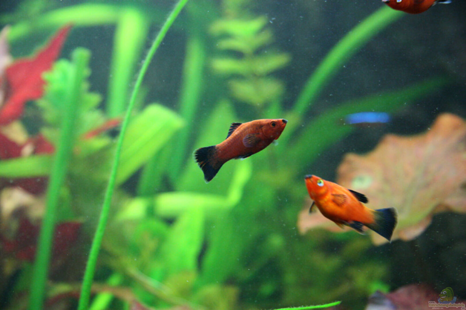 8 Wagtailplatys (2m/6w) 20 Neons 4 Smaragd-Panzerwelse 3 Antennenwelse (1m/2w) 3 Dalmatiner-Mollys (1m/2w) 4 Siamesische Rüsselbarben 3 Apistogramma agassizii (1m/2w) 5 Apistogramma cacatuoides (2m/3w) 2 Anetome Helena (Schneckenfressende Schnecken) 3 Rennschnecken