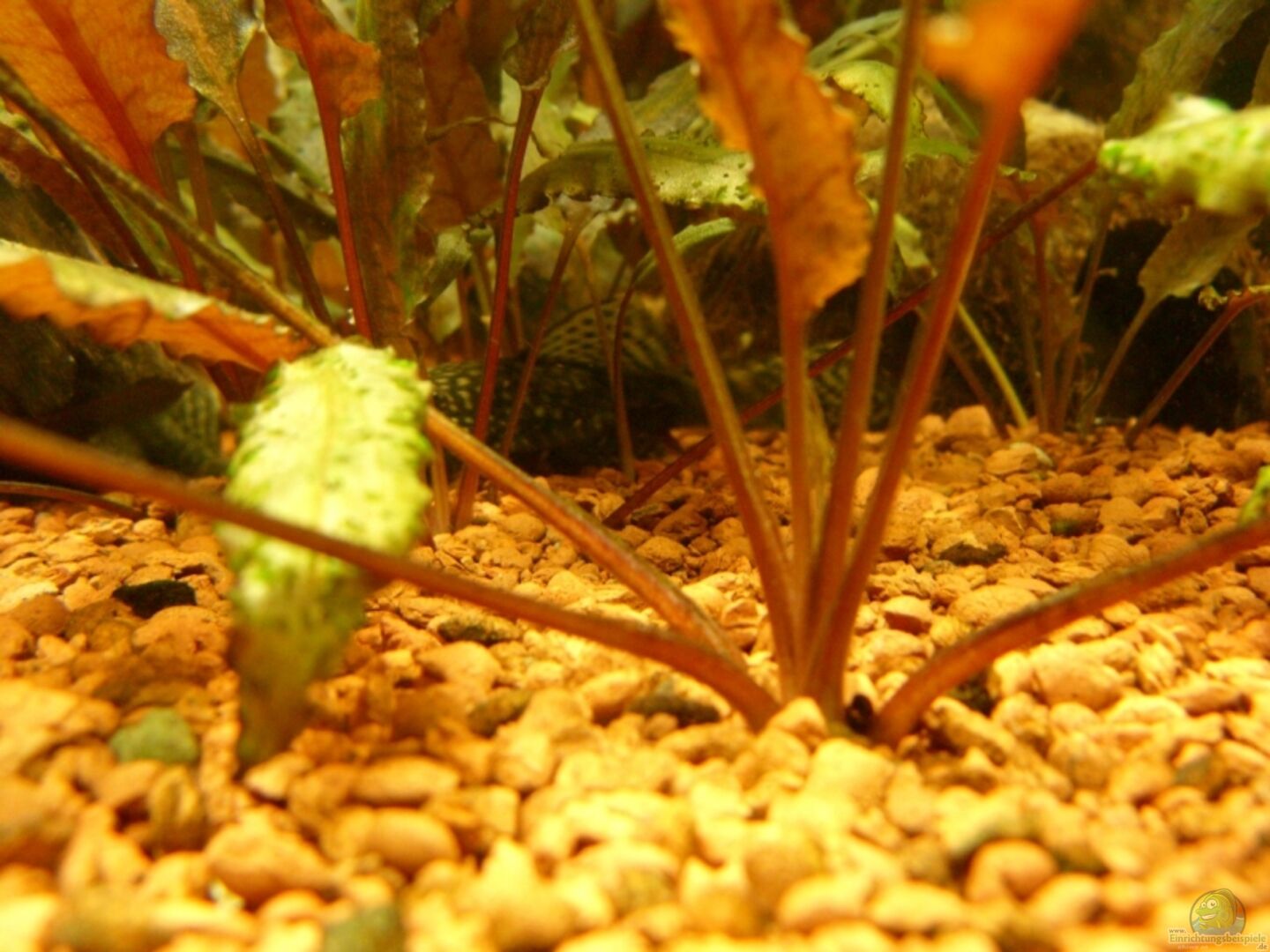 hinten rechts Vallisneria spiralis Leopard (sie wächst und wächst und......) bildet schöne Ableger, unzählige Cryptocoryne Ableger im linken und hinteren Beckenbereich als dichten Wald angelegt, drei Echinodorus bleheri vorne rechts vorm ??berlaufschacht, im mittleren Bereich drei Echinodorus-Zuchtformen deren genaue Bezeichnung ich nicht kenne, zwei kleine Anubias die aus einer sehr stark verkalkten Pflanze gerettet worden sind, an Wurzeln angebunden, in der Mitte des Beckens [...]