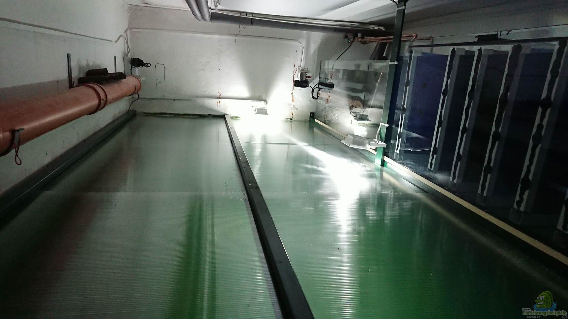 Das Becken besteht aus GFK und einer Frontscheibe. Ein Kellerraum ist durch die Frontscheibe abgetrennt worden und dahinter wurde dann mit Glasfasermatten und Epoxidharz das Becken gebaut. Die Filterung steht oberhalb des Beckens und besteht aus zwei 130cm Filterbecken.