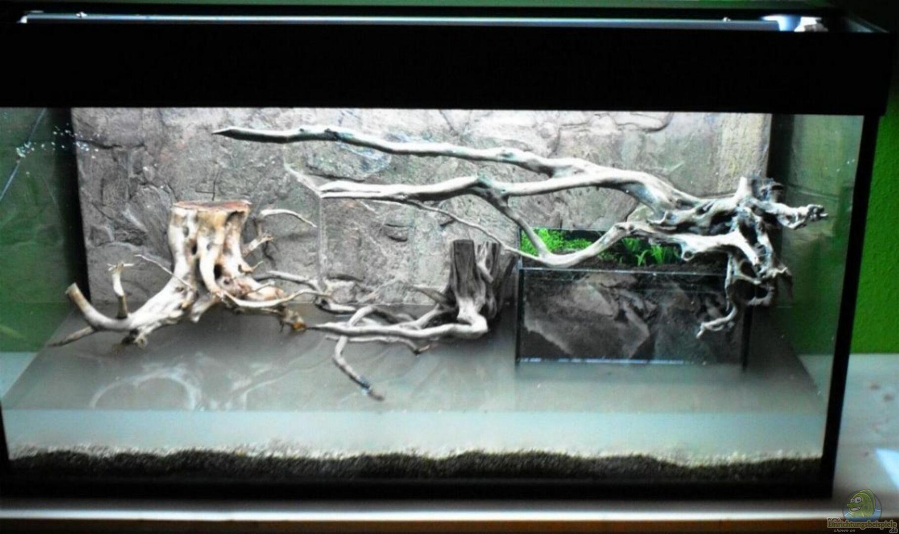 In dem Becken befindet sich eine Korköhre mit Pflanzzone Es ist nur bis etwa zur Hälfte gefüllt ( Wassermenge ungefähr 70l ) Der Besatz beinhaltet eine neozoene tropische Fischart. Es handelt sich dabei um einen Stamm der seit den 70ern in Deutschland bekannt ist und sich dem Wildtyp wieder angenähert hat.