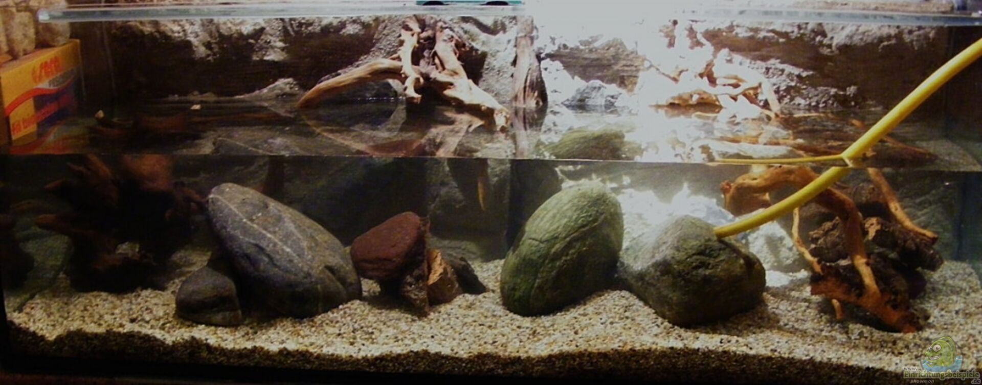 Steht auf selbstgemachtem Rahmen aus 40er Profilrohr(siehe Bild)dazu MDF-Platte und zwei Lagen Schaumstoffmatte 3mm Rückwand Selbst-Herstellung Diese besteht aus zwei Hälften und wird mit Feinstsand behandelt, um eine Uferlehm-Schicht zu bekommen Das Becken wird offen betrieben, welches die Möglichkeit ergibt mit Pflanzen zu agieren, wie man sie von den Randbepflanzungen aus den Biotopen her kennt. Dazu mehr unter sonstiges.