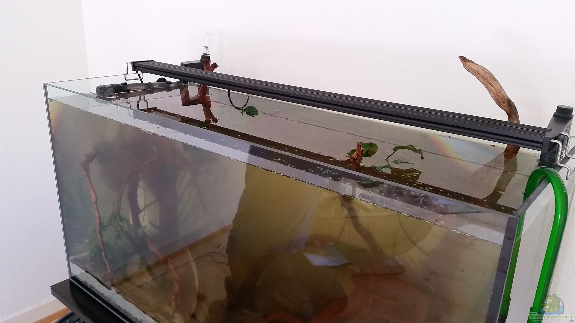Die Rückwand besteht aus einer simplen Styroporplatte, welche ich schwarz besprayed und dann hinter dem Glas befestigt hatte. Ich musste zum Glück nichts leimen, da die Platte durch die Schläuche am Glas gehalten werden. Da die Platte hinter dem Glas sind verliere ich keinen Platz im Becken, muss mir keine Sorgen um eingeklemmte Tiere oder um Giftstoffe machen.