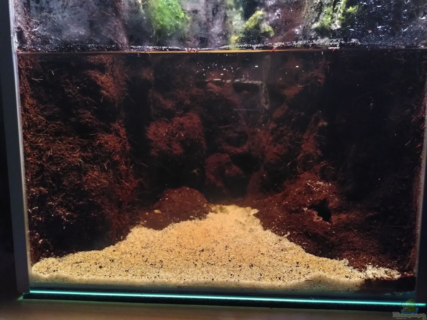 Es handelt sich um ein Standart 60cm-Becken, welches allerdings hochkant steht und vorne mit 2 30x30 cm Glasscheiben nachgerüstet wurde (unten verklebt, obere Scheibe als "Falltür"). Bei der ehemaligen Seitenscheibe, jetzt oben, wurden die Silikonnähte aufgetrennt; die Scheibe liegt jetzt lose auf.