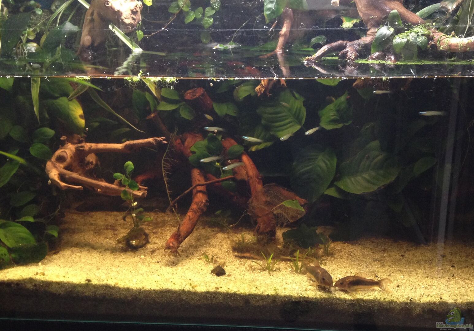 Aufsatz aus Acrylglas, Rückwand und Seitenwand aus Acrylglas und Styropor geformt bzw geklebt. Der komplette Aufbau inkl. Technik ist Eigenbau. Das gefilterte Wasser läuft über die gesamte Rückwand zurück ins Becken, wodurch in der Rückwand ein perfektes Klima für Anubia besteht und das Becken kaum Strömung aufweist. Der Wasserstand im unteren Teil kann variiert werden, da die Filterpumpe ganz unten angebracht wurde.