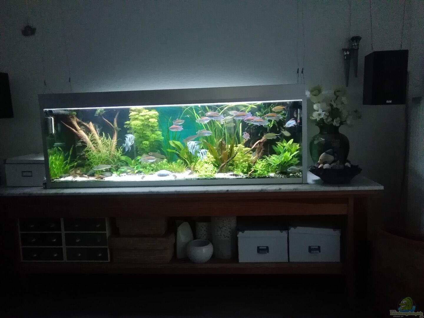 Juwel-Becken, 8 mm Float-Glas, Bodenscheibe 10 cmm Verkleidet von uns mit L-Aluschienen zur besseren Optik auf selbst gezimmertem Tisch, Filter stehen rechts und links