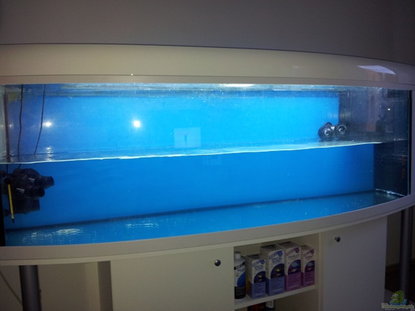 Aquarium 200x60x60cm mit gebogener Frontscheibe. Abdeckung und Unterschrank waren original in Nussbaum Farbe was aber Anfang 2012 in weiss Hochglanz umlackiert wurde. Selbst gebauter Technikteil im Becken mit ??berlaufkamm, Kammerfilter, Abschäumer und Rückförderpumpe.