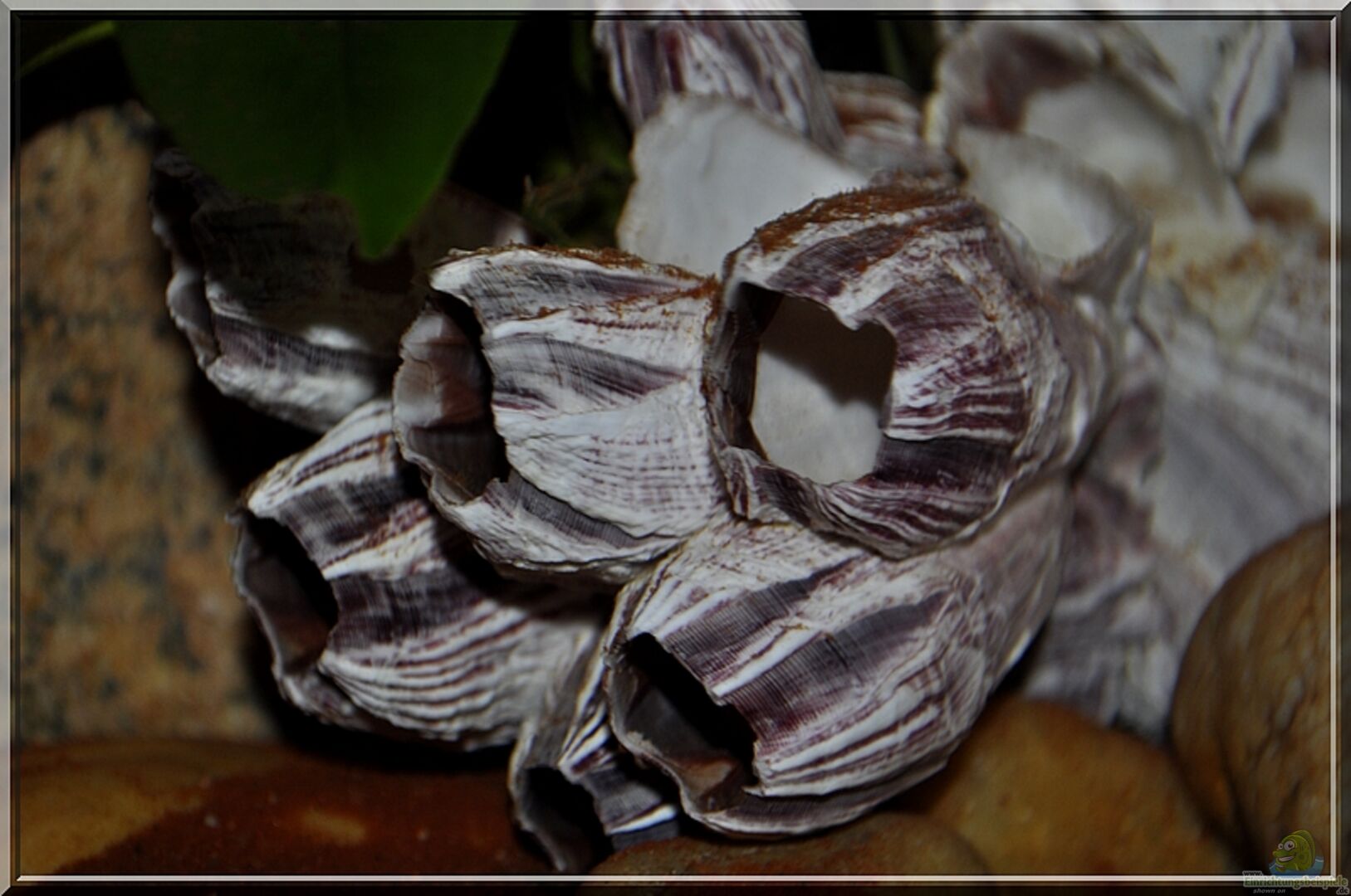 ca. 15kg gesammeltes, gebürstete und abgekochte Flusskieselsteine im Hintergrund aufgebaut mit Spalten/Höhlen, sowie kleine Kieselsteine als Geröll-Ausläufer (hauptsächlich für die Altolamprologus conpressiceps). Alles auf 1cm Styropor zum Schutz des Bodenglases. Verschiedene JUWEL-Slim-Line Module ???Roter Gnei????? an der Rückwand, den Seiten und als Innenfilter-Verkleidung mit zusätzlicher Filtermatte dazwischen. ***** - viele Weinbergschneckenhäuser (derzeit 19 Stück) - [...]