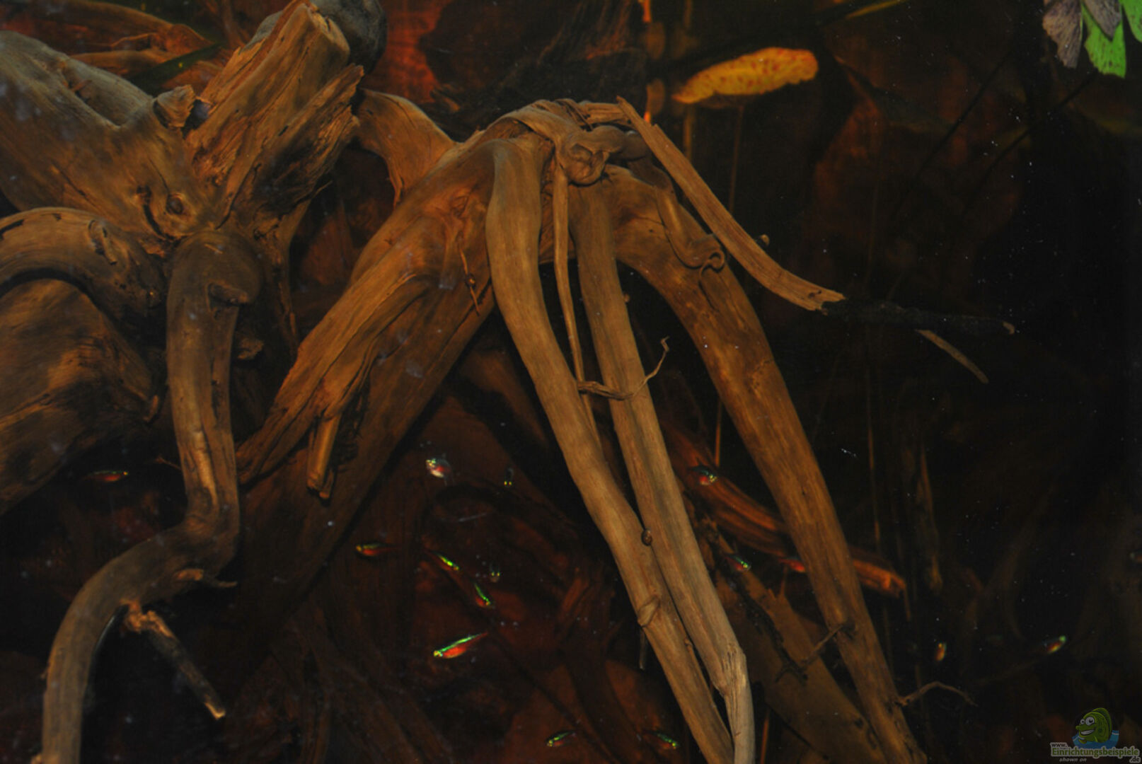 WURZEL WURZEL WURZEL Da mein Leitungswasser hier im PH Wert eher hoch (alkalisch) ist (knapp über PH 7) kommt mir die typische Gestalt des Rio Negros mit viel Wurzeln und Holz (im Uferbereich) sehr nahe. Durch die ausschliessliche Verwendung von Moorkienholz, drücke ich den Ph Wert durch die Abgabe von Huminsäure in einen recht annehmbaren Wert. Anfangs habe ich noch über Torf gefiltert, als sich das Becken jedoch eingespielt hat und ich das richtige Ma?? an Zugabe von Zapfen und Blättern [...]