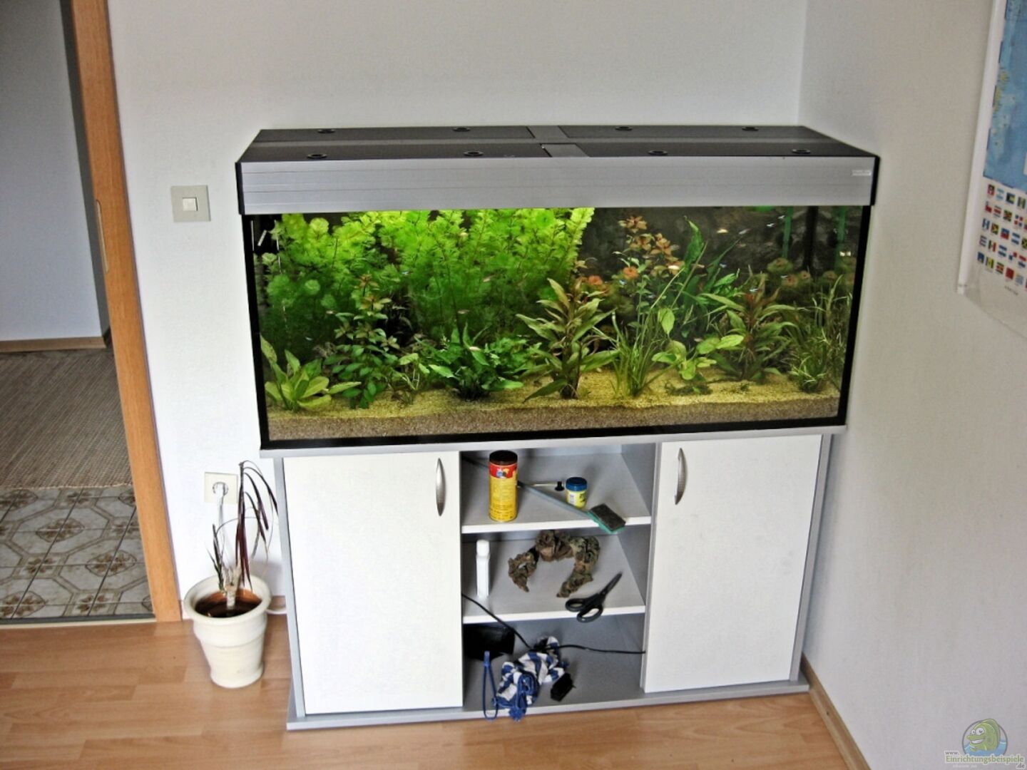 Das Becken kommt von Aqua Boro aus Augsburg. Es ist ein Standardaquarium mit den Ma??en 120x40x50, Glasstärke: 0, 8. Es hat eine Aluminiumabdeckung und den dazu passenden Unterschrank. Den habe ich noch wei?? lackiert. Ich freue mich über ernstgemeinte Ratschläge, Ideen und Kritiken...