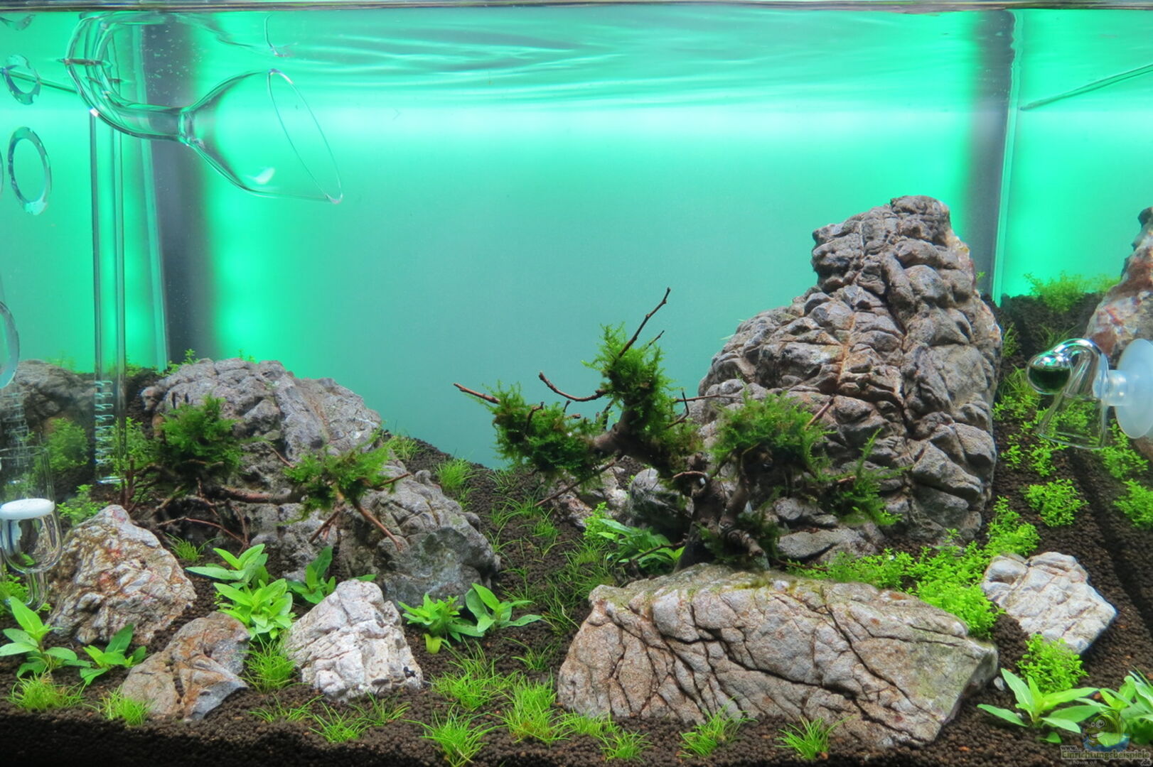 Dies ist mein erstes Becken im Bereich Aquascaping. Bei dem Becken handelt es sich um ein Nano Becken der Firma "blau Aquaristik". Das Becken hat abgerundete Kanten an der Frontscheibe und ist hinten transparent verklebt. Die Rückwandbeleuchtung ist selbst gebaut (siehe "Sonstiges").