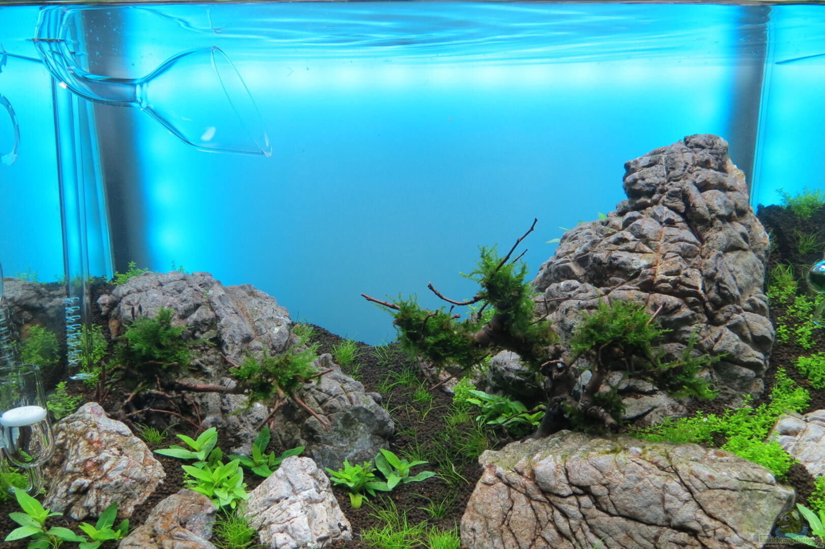 Dies ist mein erstes Becken im Bereich Aquascaping. Bei dem Becken handelt es sich um ein Nano Becken der Firma "blau Aquaristik". Das Becken hat abgerundete Kanten an der Frontscheibe und ist hinten transparent verklebt. Die Rückwandbeleuchtung ist selbst gebaut (siehe "Sonstiges").