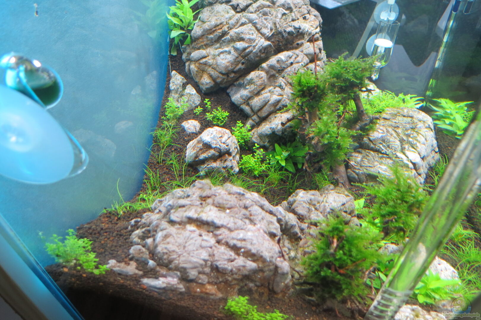 Dies ist mein erstes Becken im Bereich Aquascaping. Bei dem Becken handelt es sich um ein Nano Becken der Firma "blau Aquaristik". Das Becken hat abgerundete Kanten an der Frontscheibe und ist hinten transparent verklebt. Die Rückwandbeleuchtung ist selbst gebaut (siehe "Sonstiges").